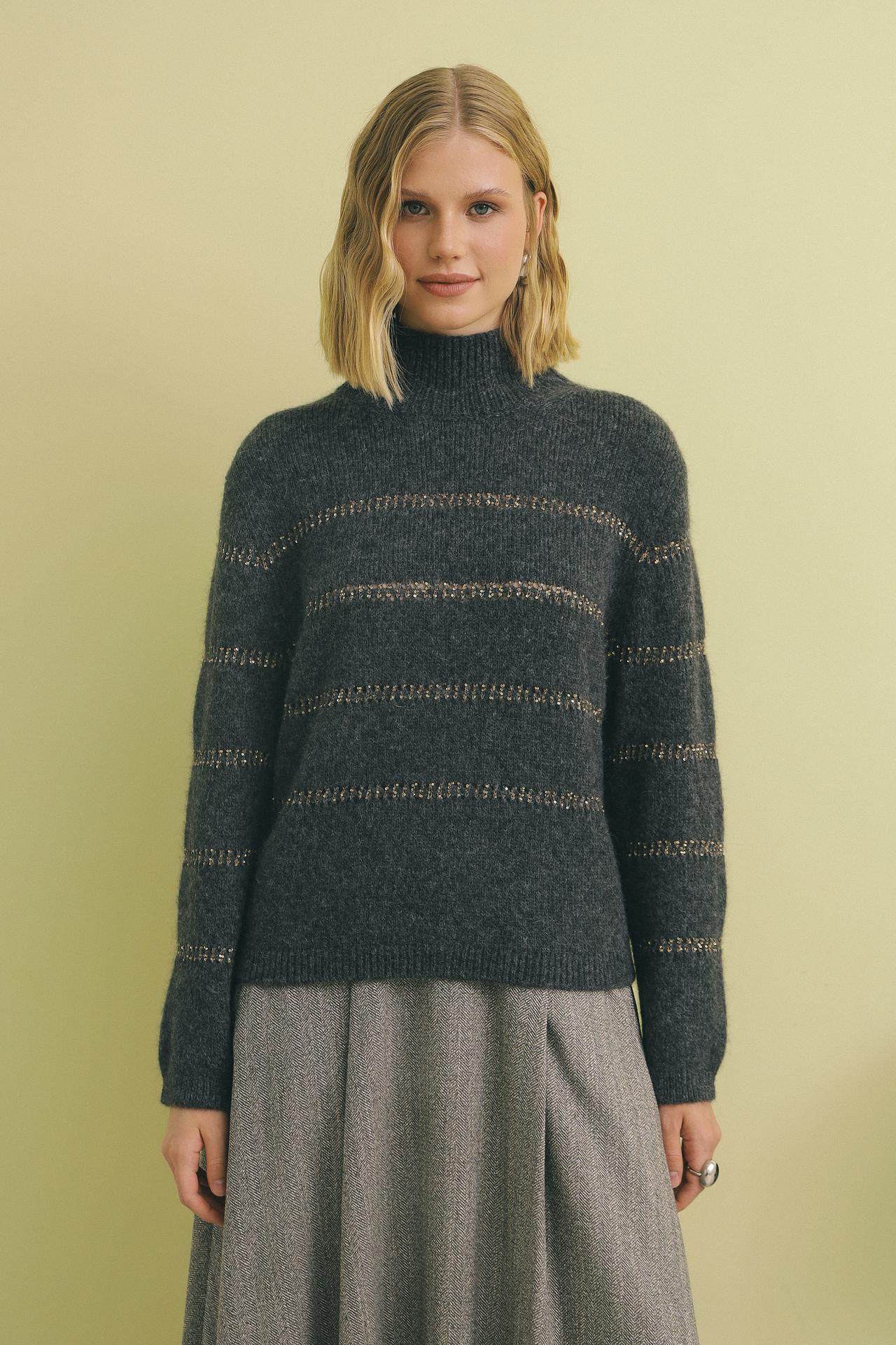 Элегантный женский пуловер от Luisa Cerano - это идеальное сочетание комфорта и стиля. Модель выполнена в классическом сером цвете и украшена деликатными золотистыми полосами, которые придают изделию особый шарм.