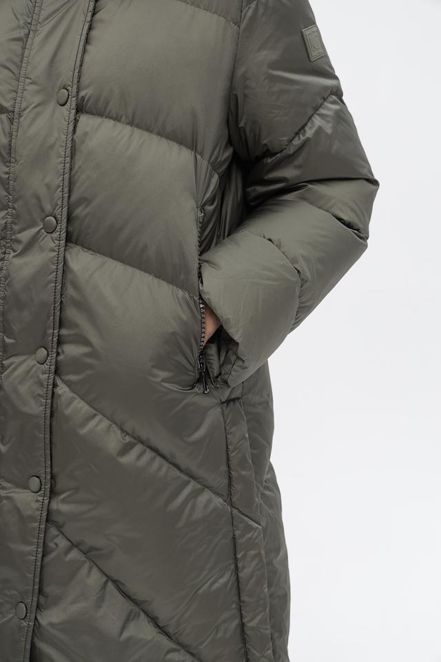 Модель отличается стеганой фактурой и актуальным оливковым цветом. Застежка-молния и кнопки обеспечивают надежную фиксацию, а удобный капюшон защитит от ветра и осадков.