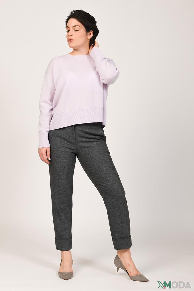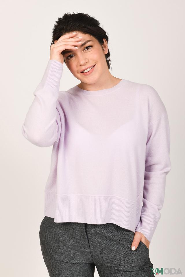 Пуловер имеет классический прямой крой, круглый вырез горловины и длинные рукава. Мягкий лавандовый оттенок придаёт изделию нежность и женственность. Эластичный низ и манжеты рукавов обеспечивают удобную посадку по фигуре.