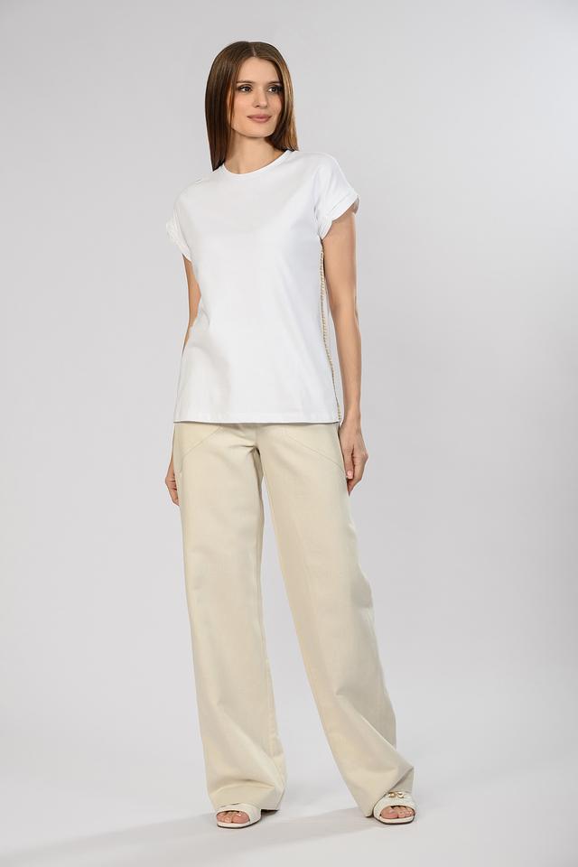 Декоративная отделка по переду добавляет изысканности и делает эту футболку особенной. Она идеально подходит для создания повседневных образов, а также для более нарядных выходов.
