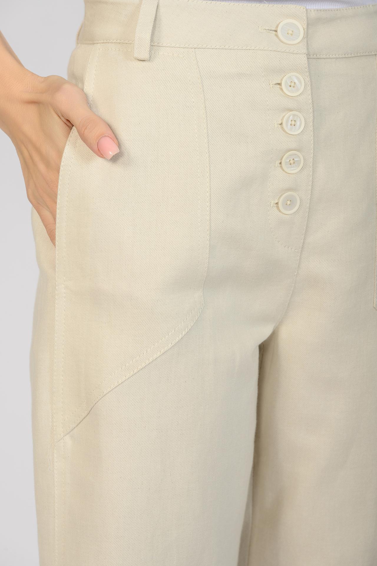 Модель оснащена удобной высокой талией и функциональными боковыми карманами, которые гармонично дополняют силуэт. Элегантная застежка на ряд пуговиц добавляет изысканности и подчеркивает классический стиль изделия, делая эти широкие брюки универсальными как для повседневных, так и для более формальных образов.