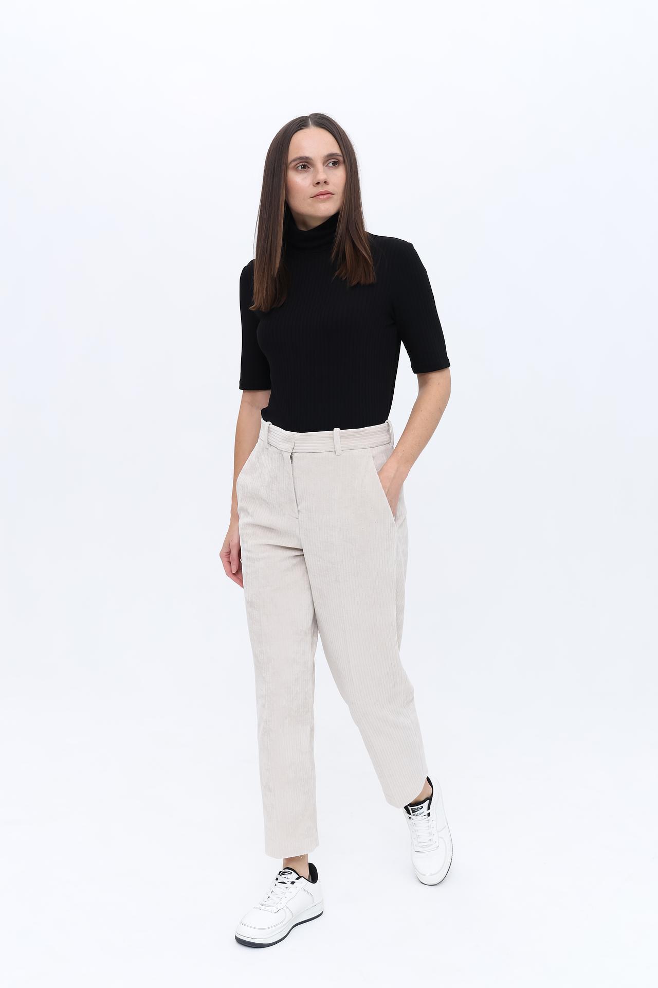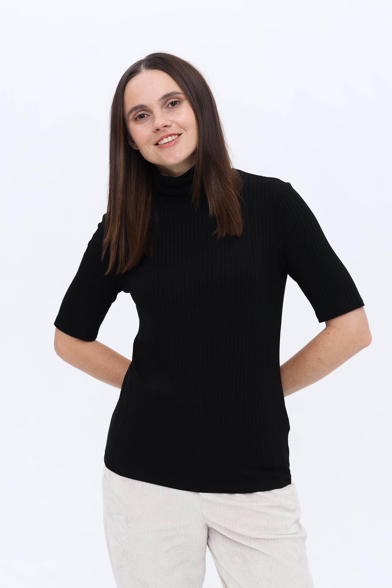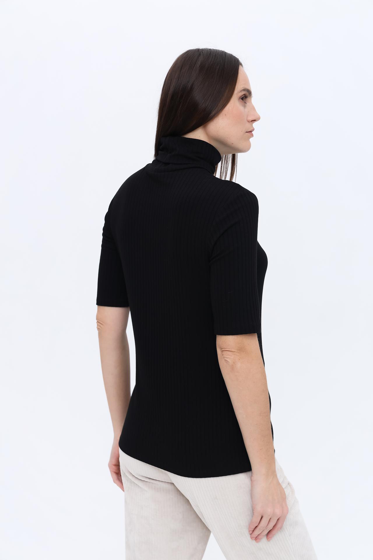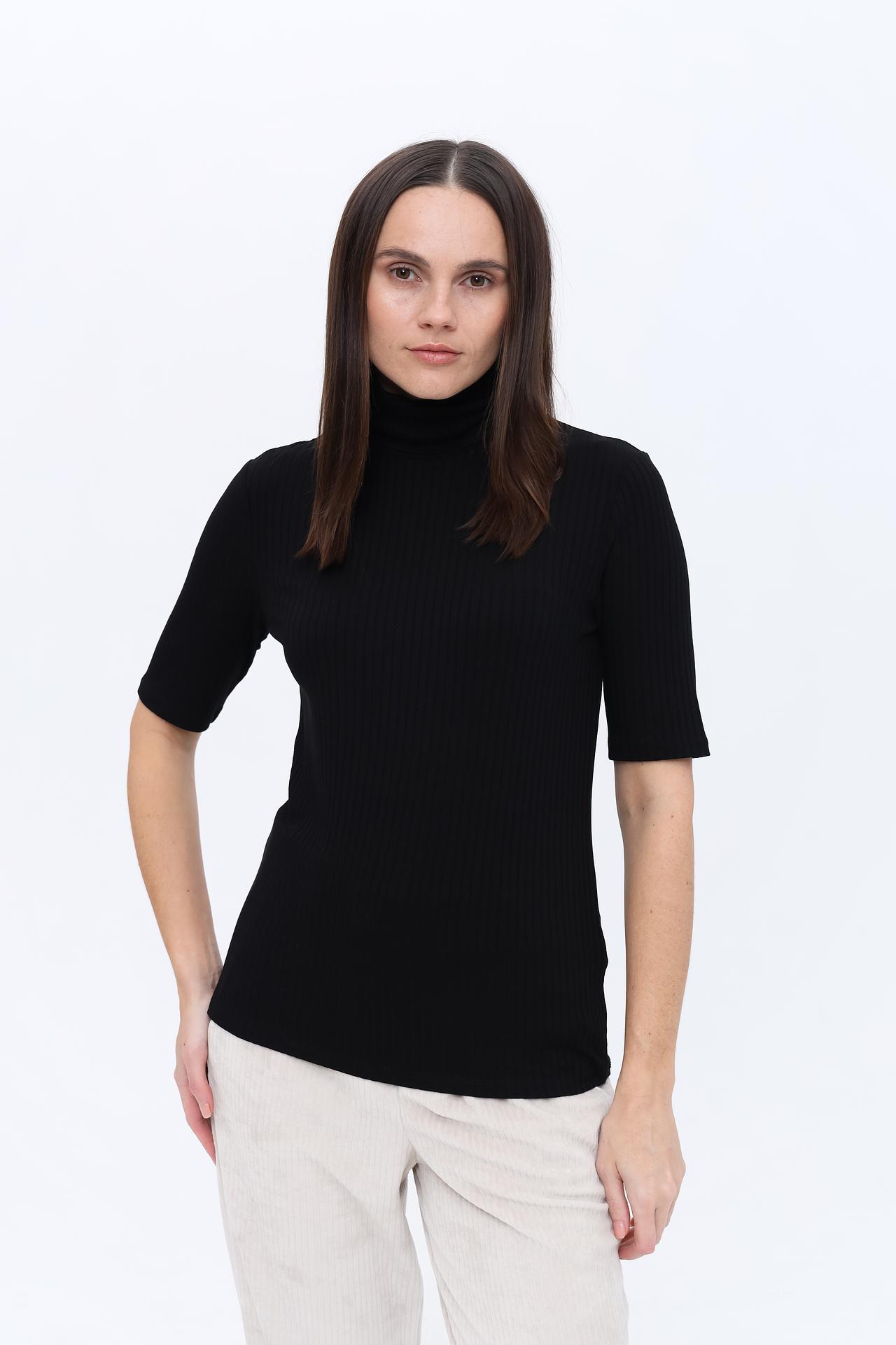 - Крой: Приталенный силуэт выгодно подчеркивает достоинства фигуры, создавая женственный и элегантный образ. Короткий рукав делает водолазку универсальной для разных сезонов и стилей.