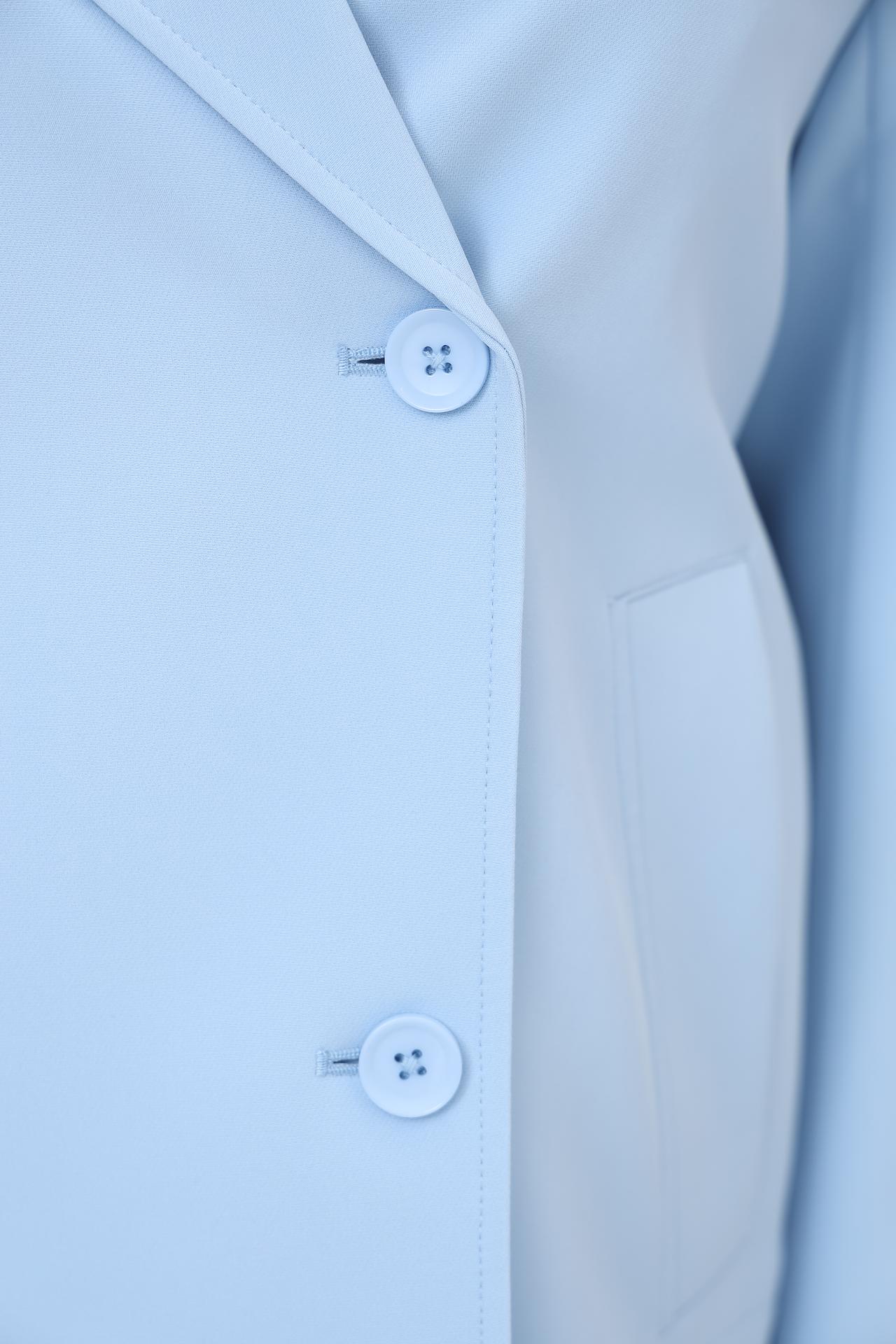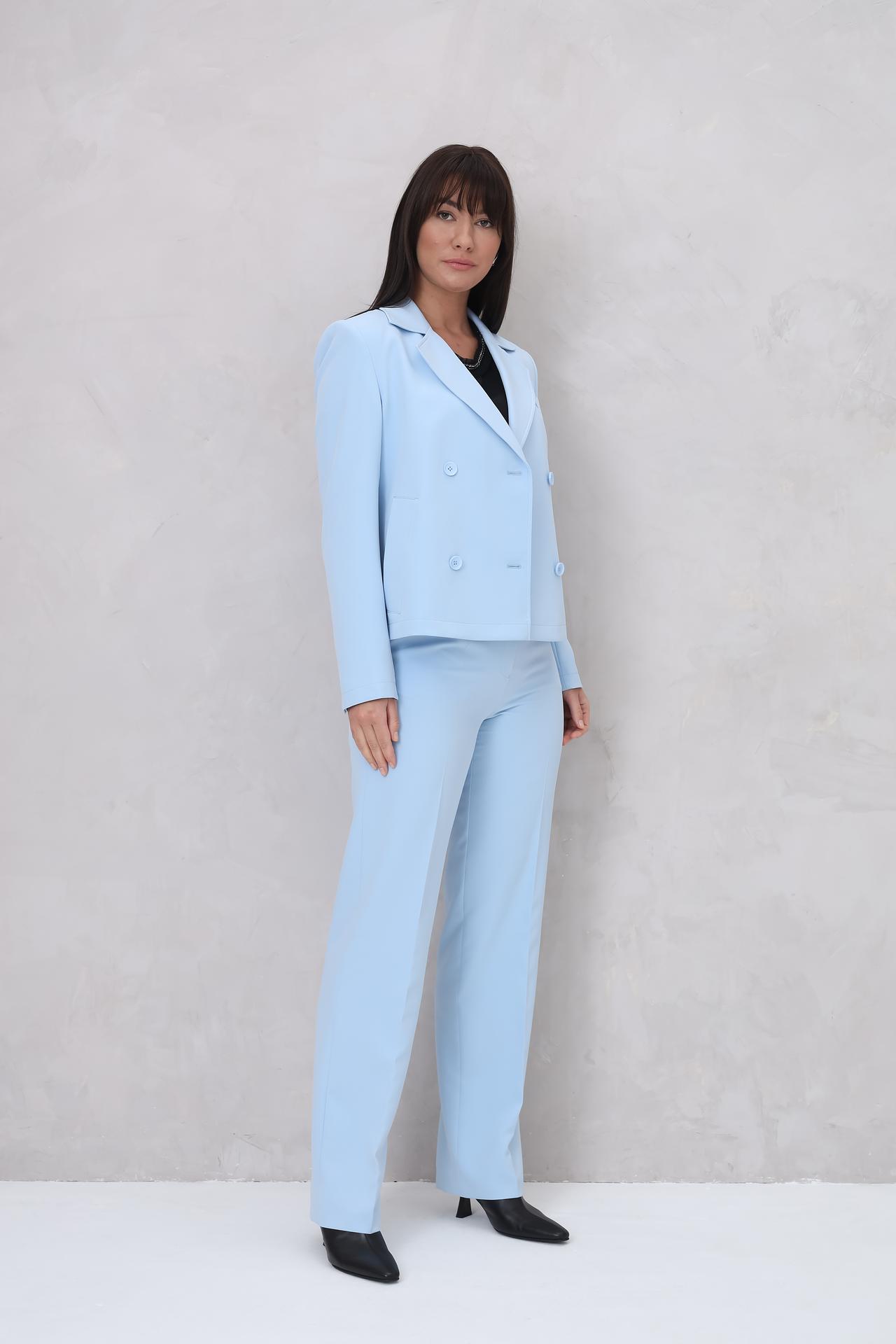 - Цвет и универсальность: Нежный голубой оттенок делает этот жакет освежающим акцентом в гардеробе, легко сочетающимся как с нейтральными, так и с контрастными цветами. Идеально подходит для офиса, деловых встреч или элегантных повседневных комплектов.