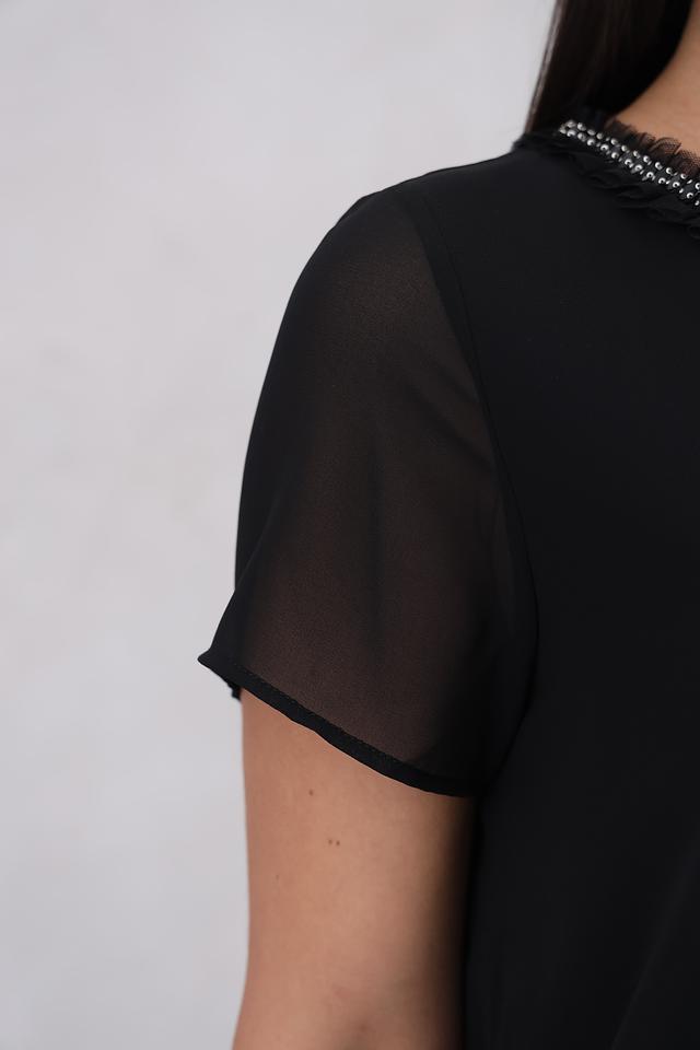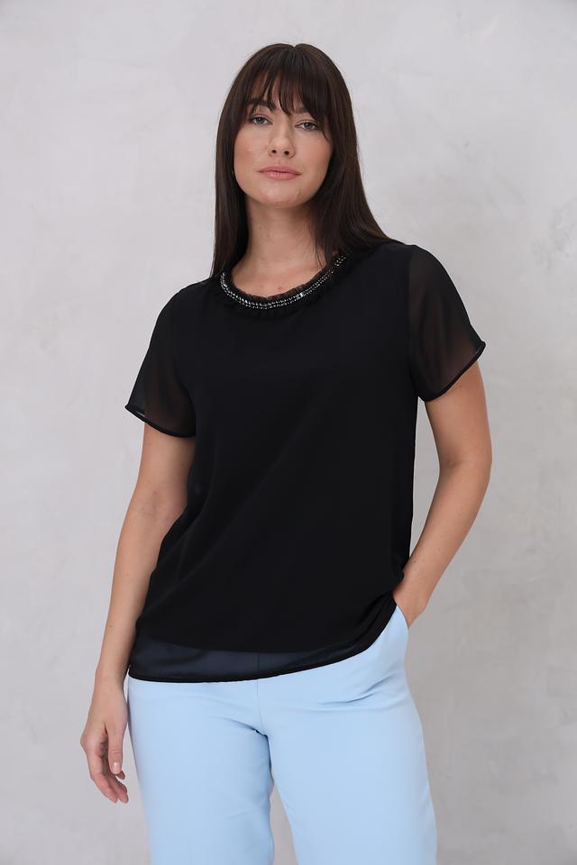 Чёрная блуза Marc Aurel из полиэстера с короткими рукавами и декоративной отделкой горловины. Модель имеет свободный крой и полупрозрачные рукава, что придает ей лёгкость и изящество. Состав: полиэстер 100%