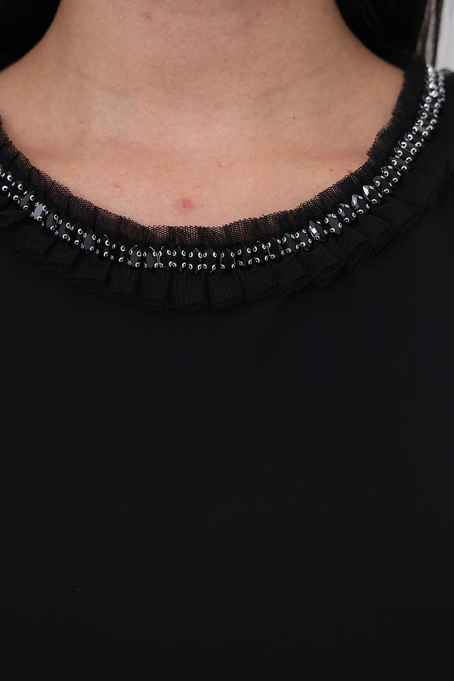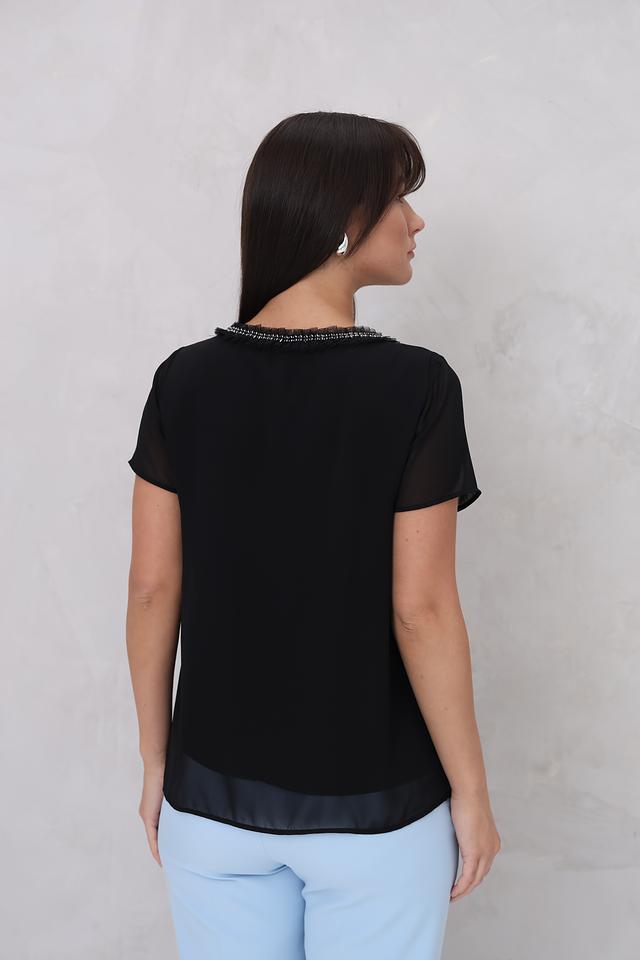 Блуза имеет свободный крой, который обеспечивает комфорт в носке. Короткие рукава выполнены из полупрозрачной ткани, что добавляет модели лёгкости и воздушности. Особое внимание привлекает декоративная отделка горловины – изящная вышивка, выполненная в тон изделия.