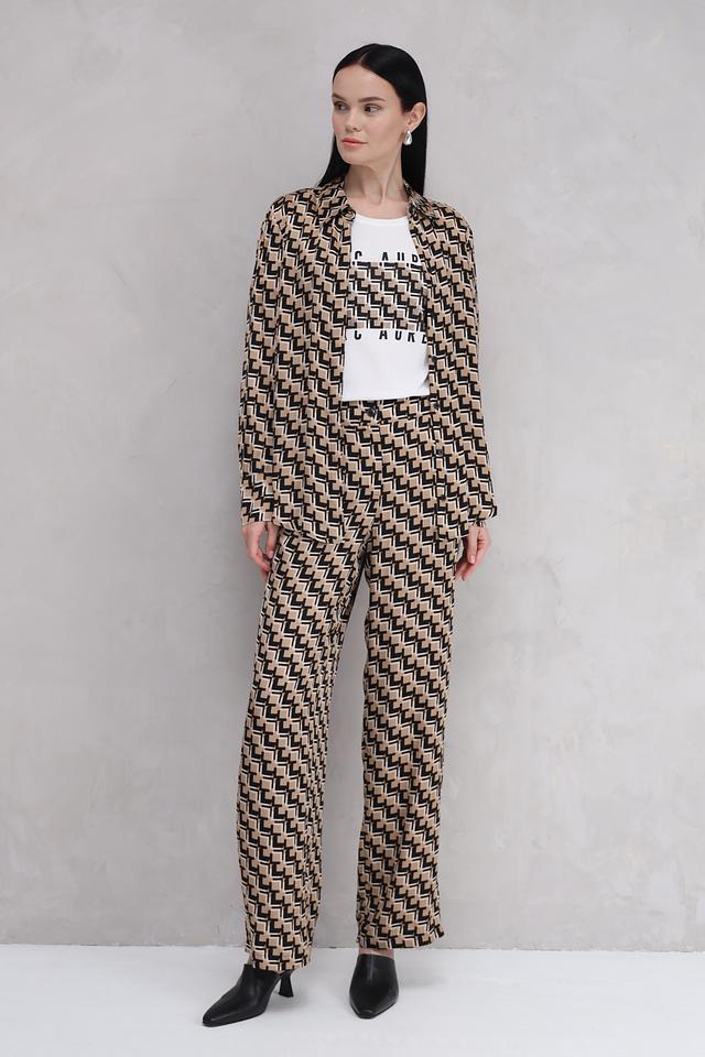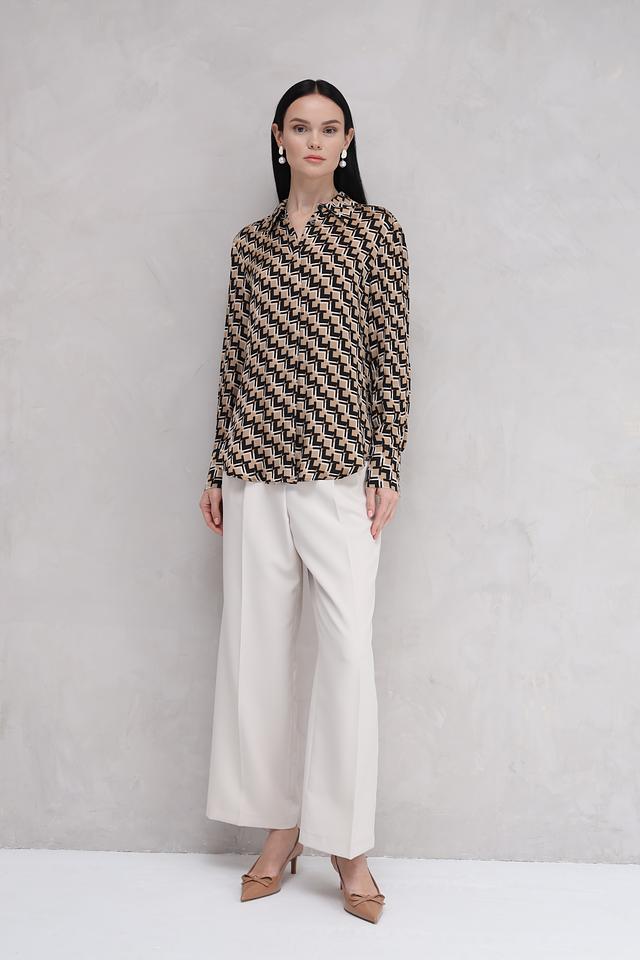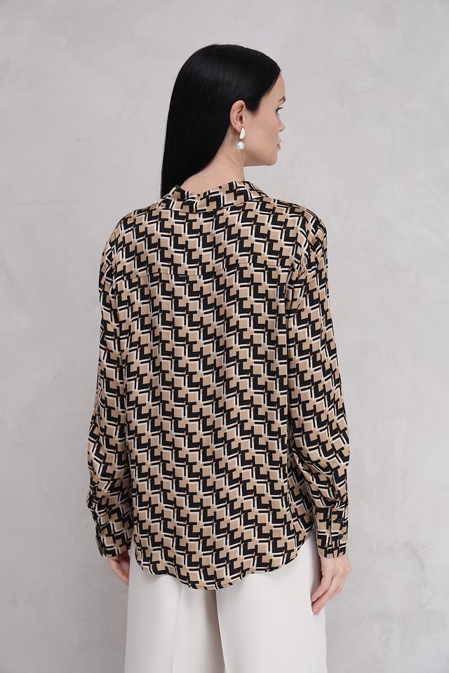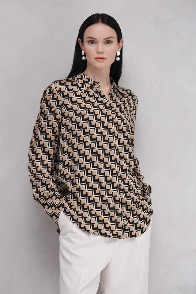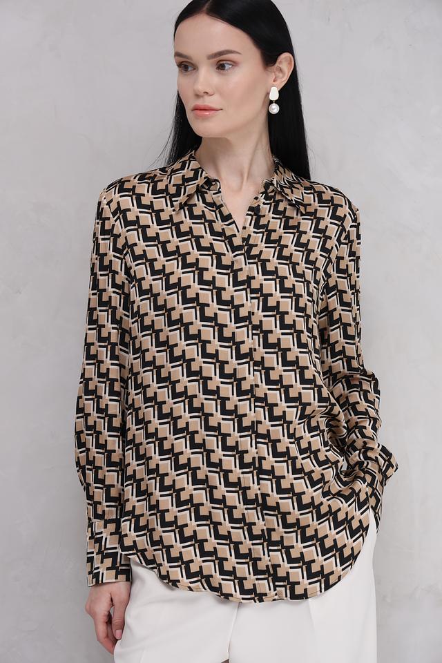 Рубашка имеет длинные рукава и классический крой, который подходит для различных типов фигур. Особенностью модели является стильный геометрический принт в бежевых и коричневых тонах, который добавляет изысканности и оригинальности.