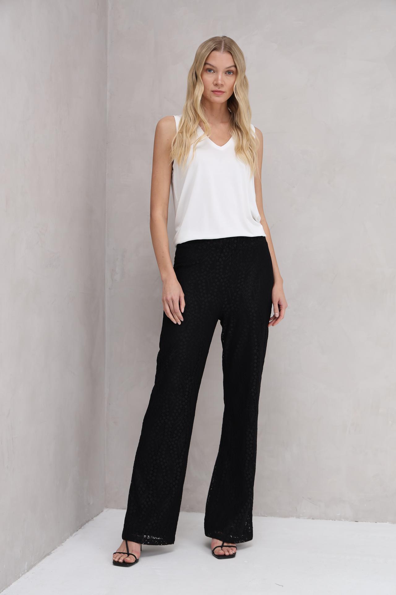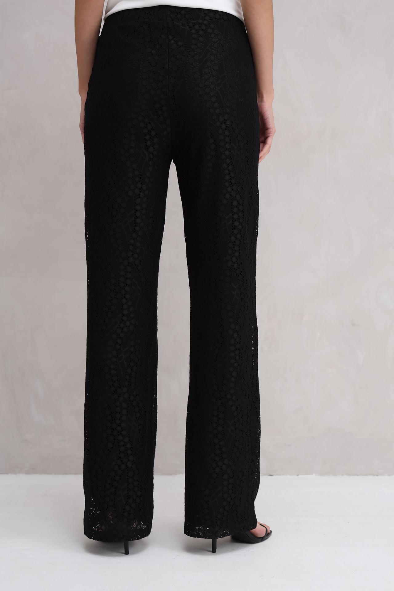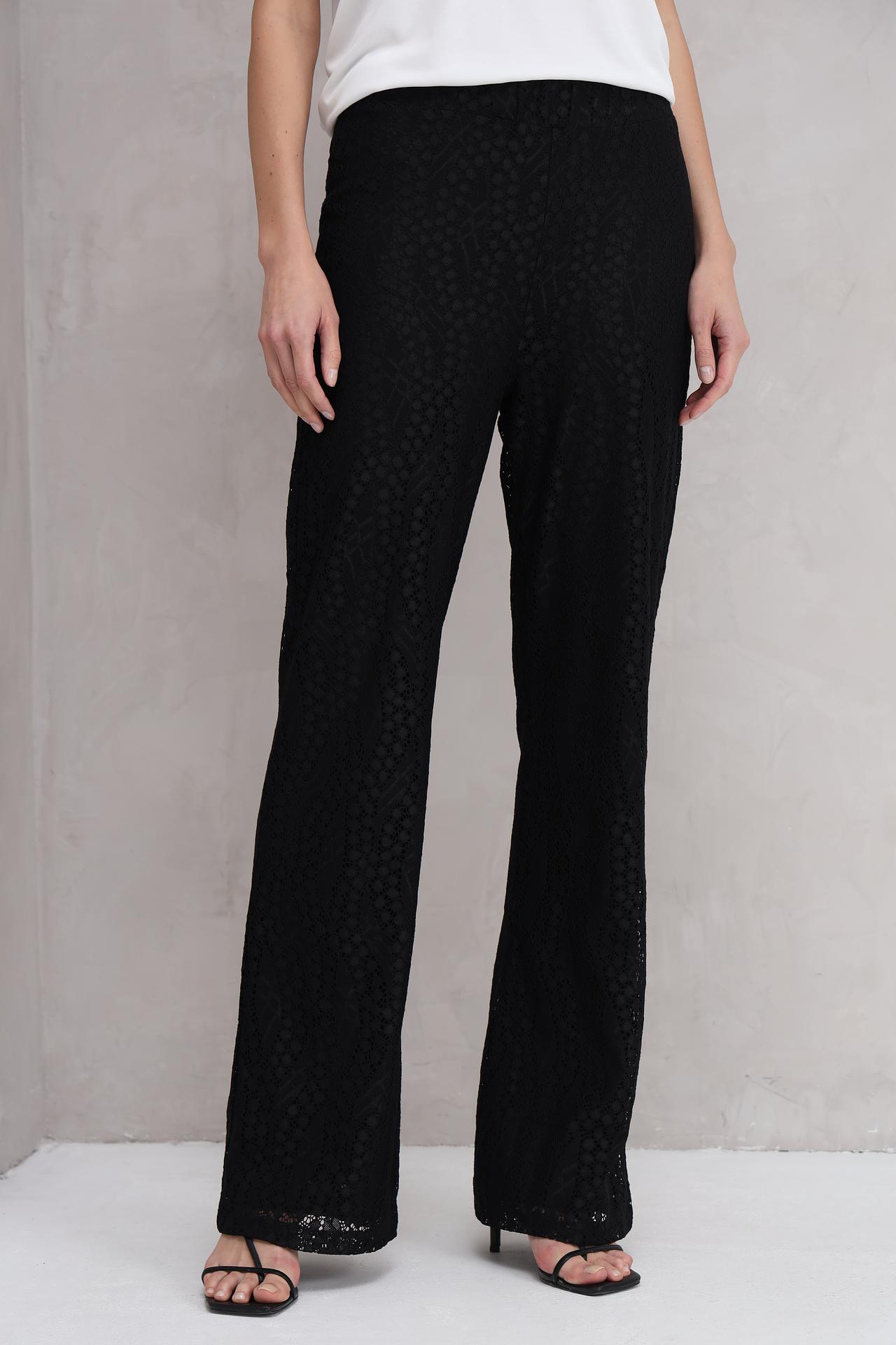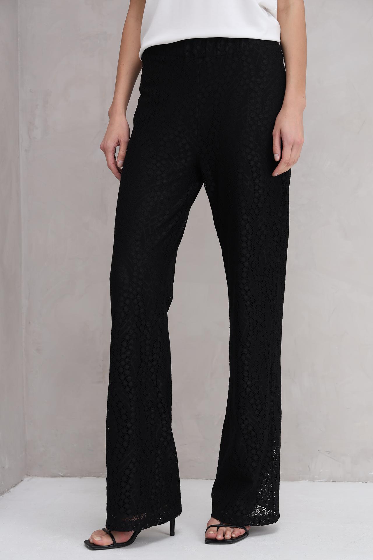 - Дизайн: Брюки прямого кроя с высокой талией, визуально удлиняющие силуэт. Оригинальный кружевной узор по всей поверхности добавляет изделию изысканности и делает его акцентным элементом гардероба.