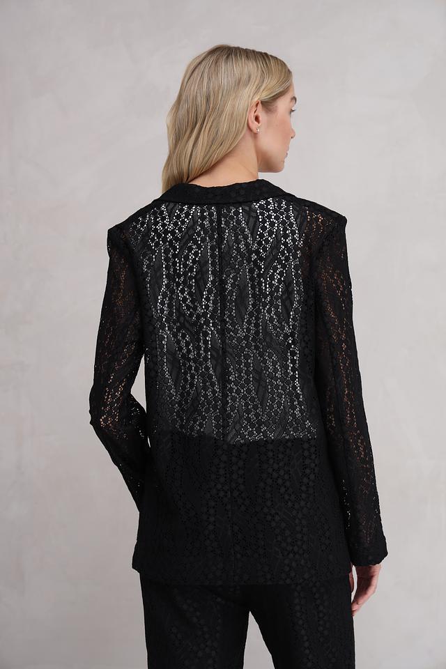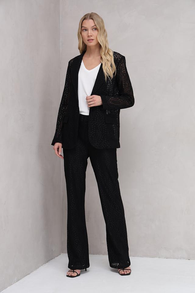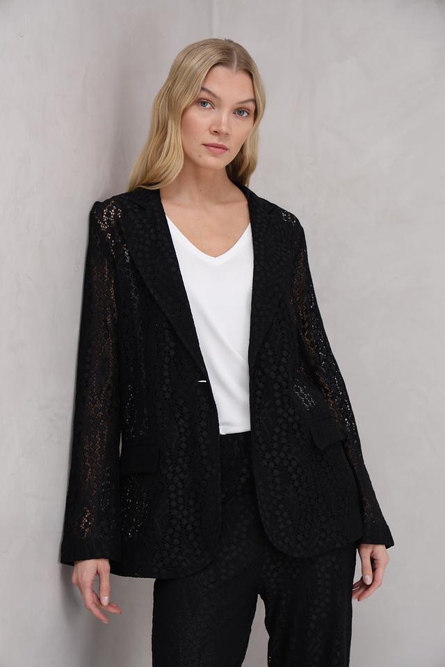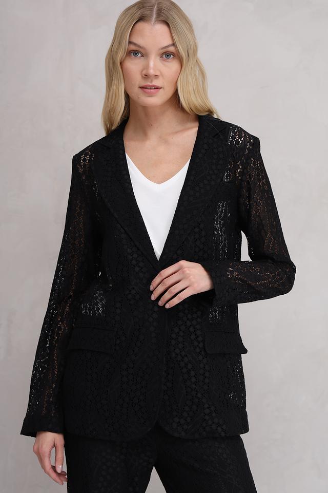 Жакет имеет классический силуэт с лацканами, длинными рукавами и застёжкой на пуговицы. Особенностью модели является кружевное оформление, придающее ей элегантность и женственность.