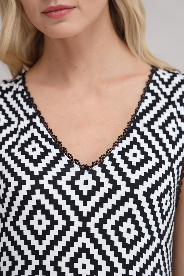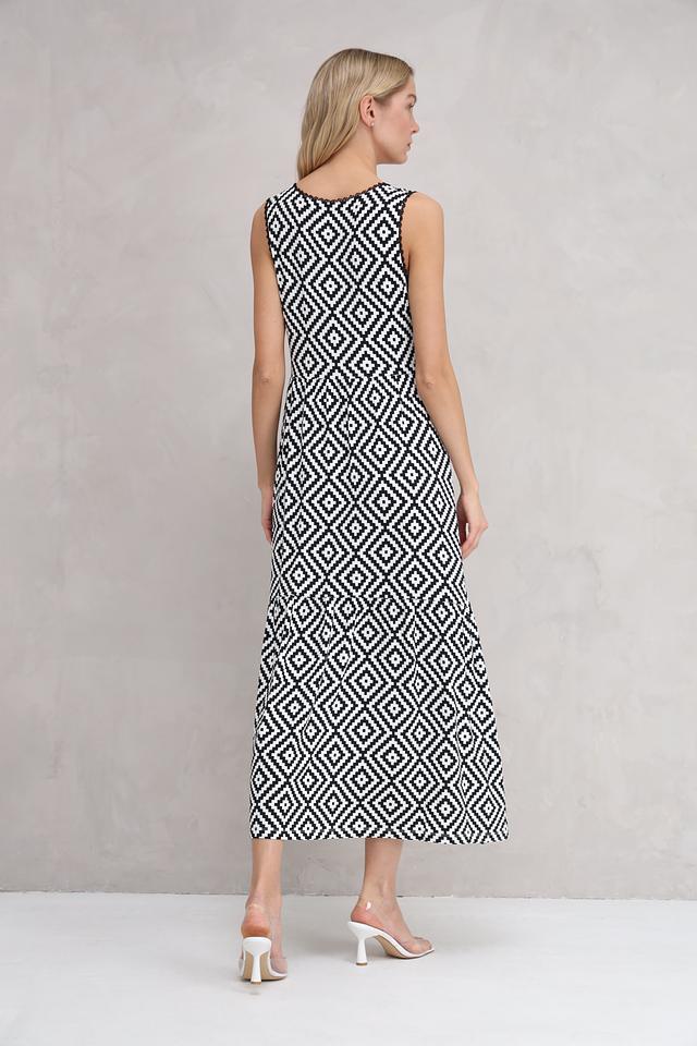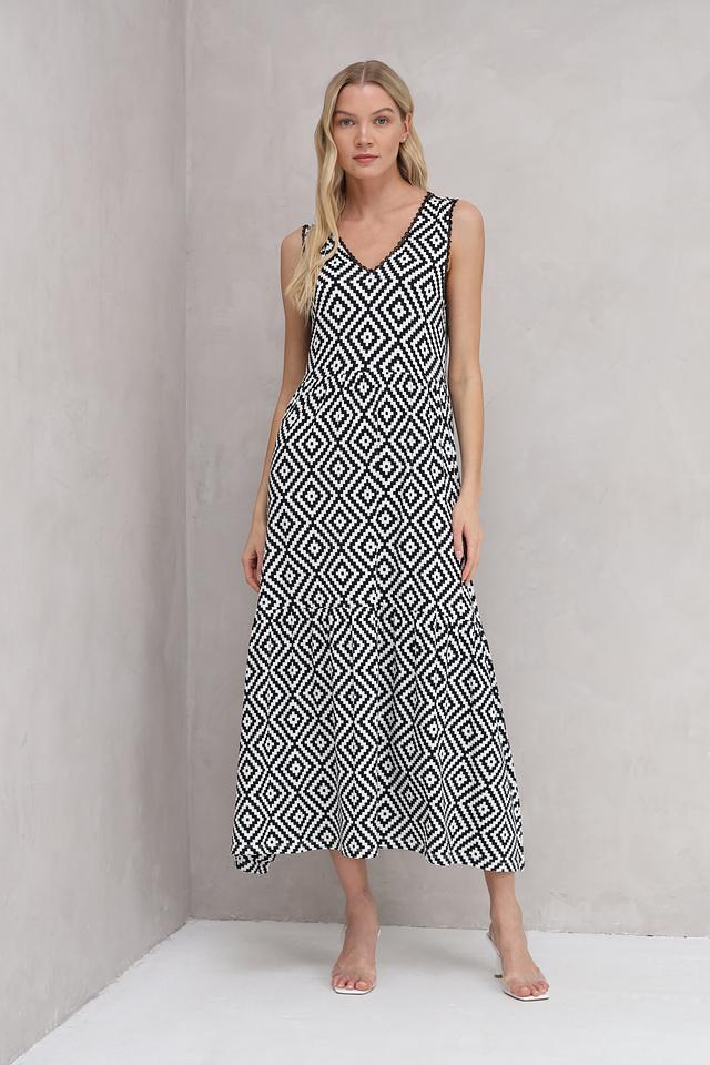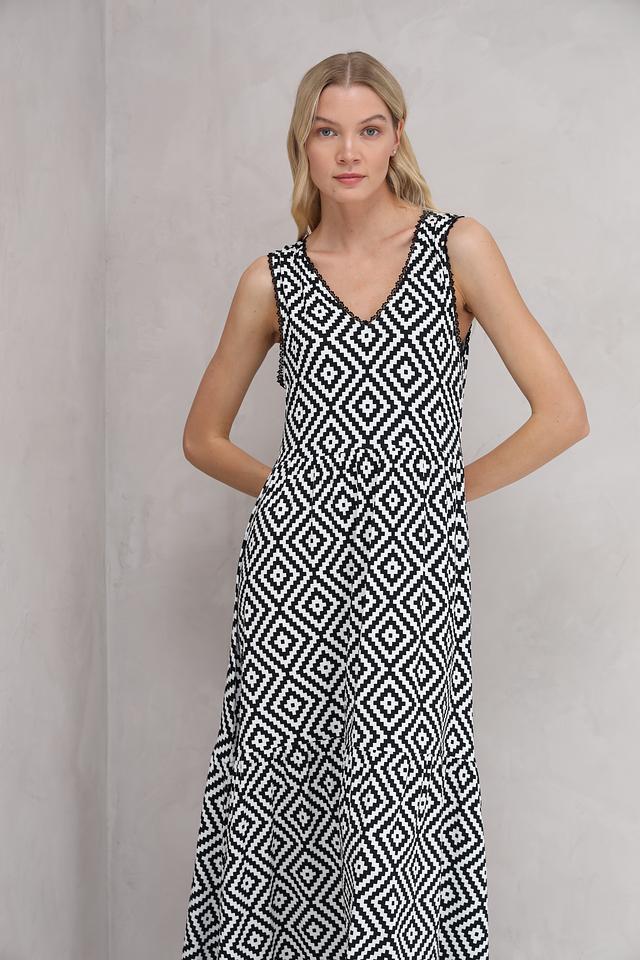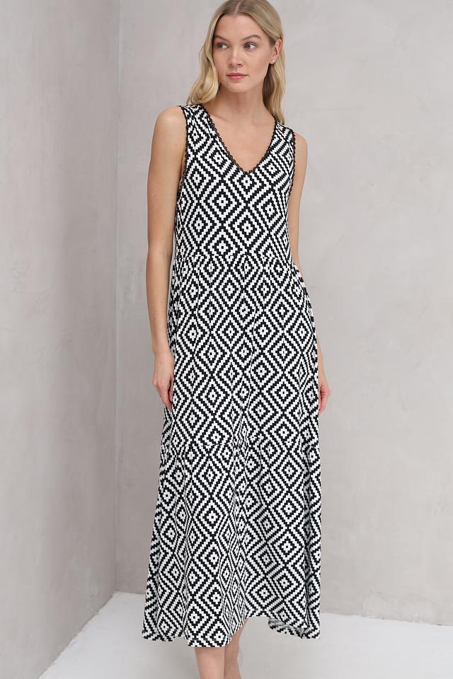 Платье Marc Aurel чёрно-белого цвета с геометрическим принтом в виде ромбов. Легкое и комфортное платье из вискозы и эластана идеально подойдет для повседневной носки и летних прогулок. Состав: вискоза 95%, эластан 5%