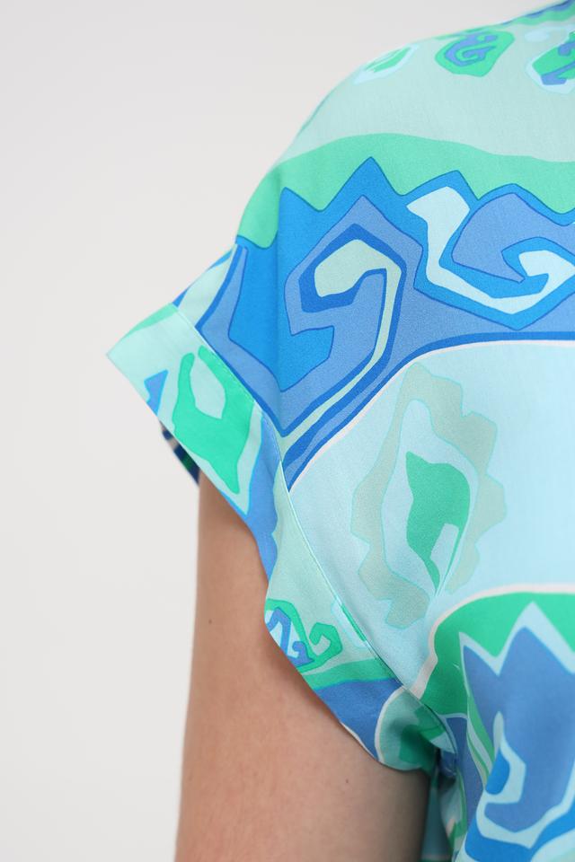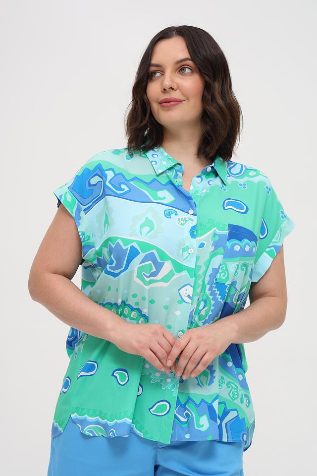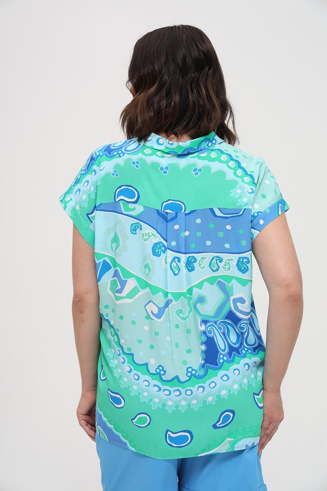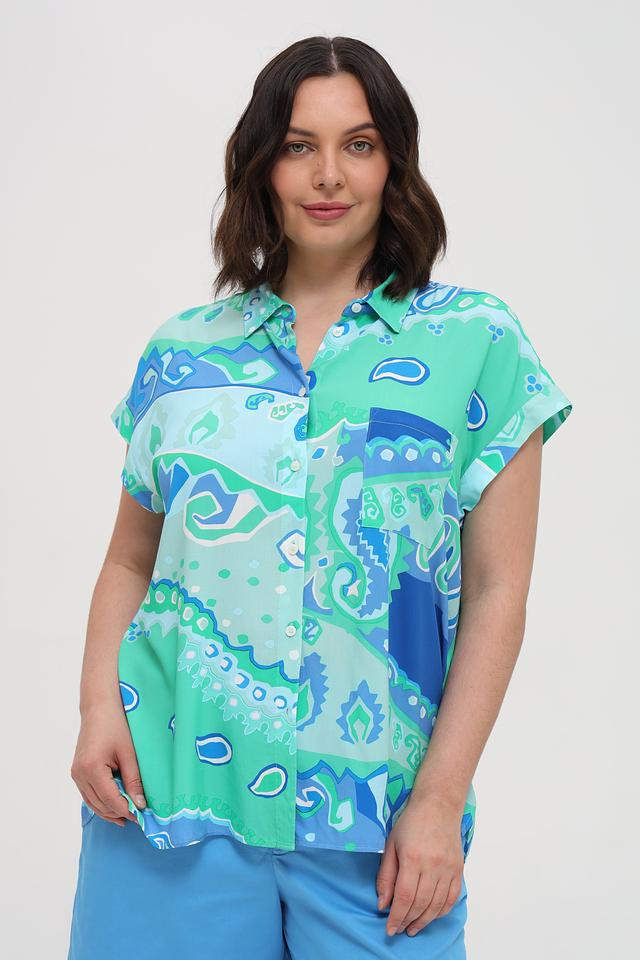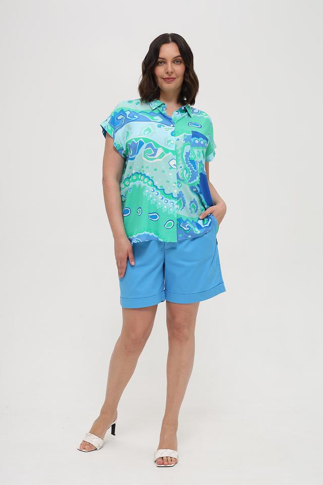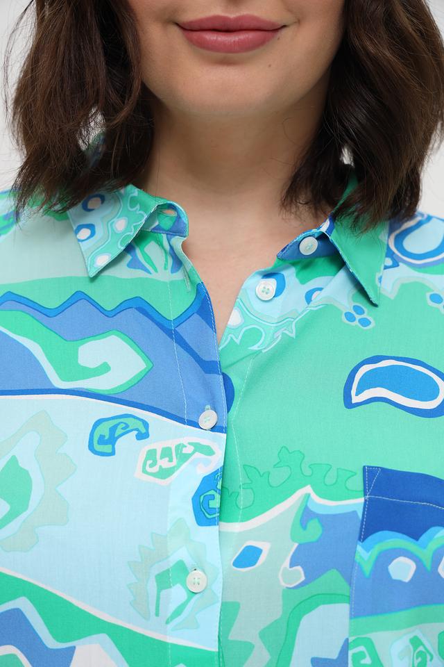 Рубашка имеет свободный крой, короткие рукава и классический воротник. Особенностью модели является эффектный абстрактный принт, сочетающий в себе оттенки бирюзового и синего.