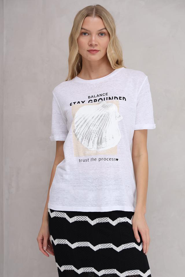 Особенностью данной модели является яркий принт на лицевой стороне, изображающий раковину и надписи на английском языке. Принт выполнен в чёрно-белой гамме, что добавляет контрастности и выразительности образу. Круглый вырез горловины и короткие рукава делают футболку универсальной и подходящей для повседневной носки.