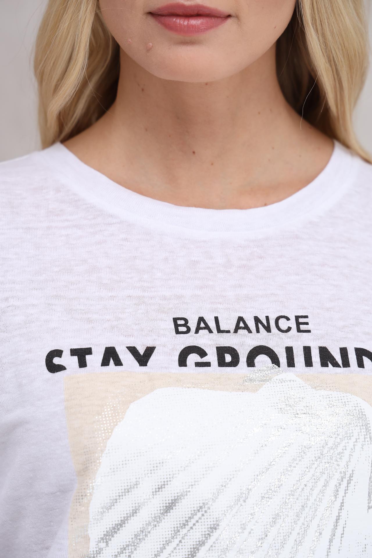 - Декор: Оригинальный принт с морской ракушкой и мотивирующими надписями "Balance Stay Grounded", "trust the process". Добавляет индивидуальности и стиля, делая футболку заметным акцентом в повседневном образе.