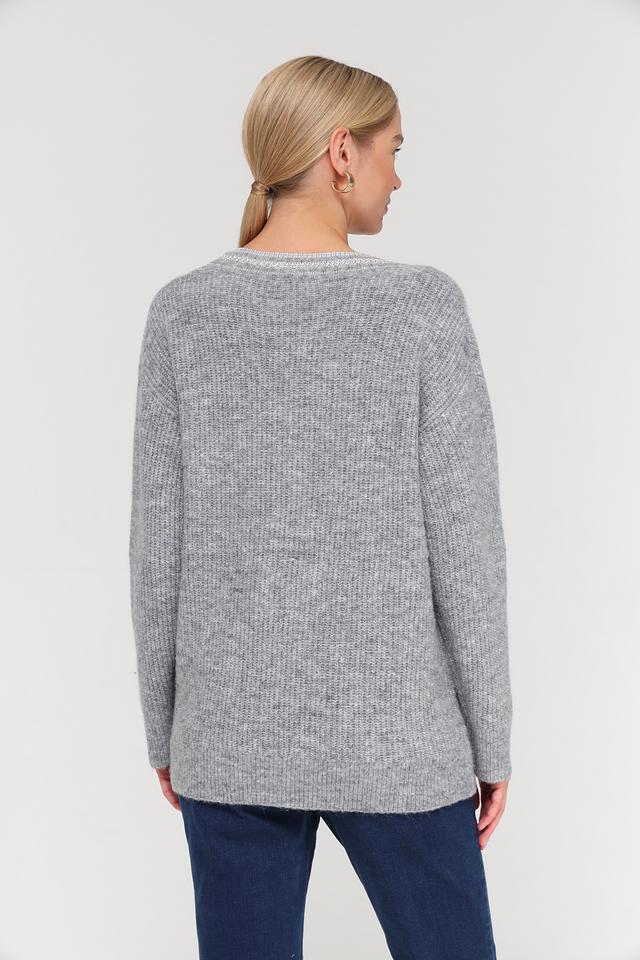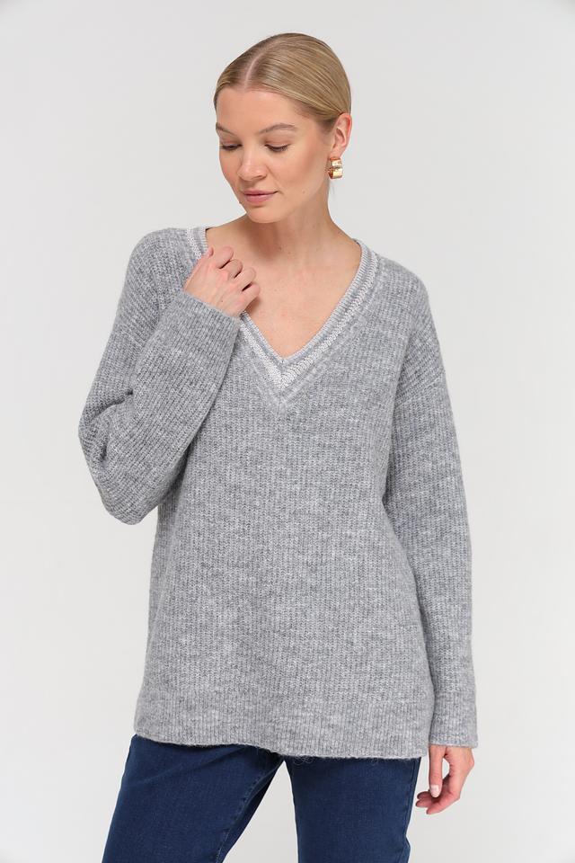 Пуловер имеет V-образный вырез, который визуально удлиняет шею и придает образу элегантность. Свободный крой обеспечивает комфорт и свободу движений, а длинные рукава защищают от прохлады.