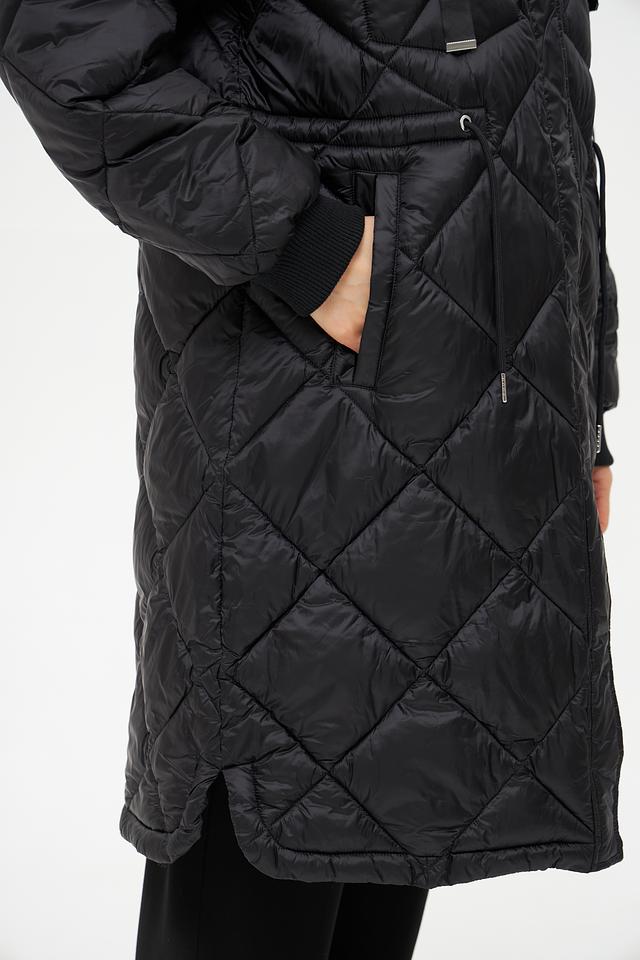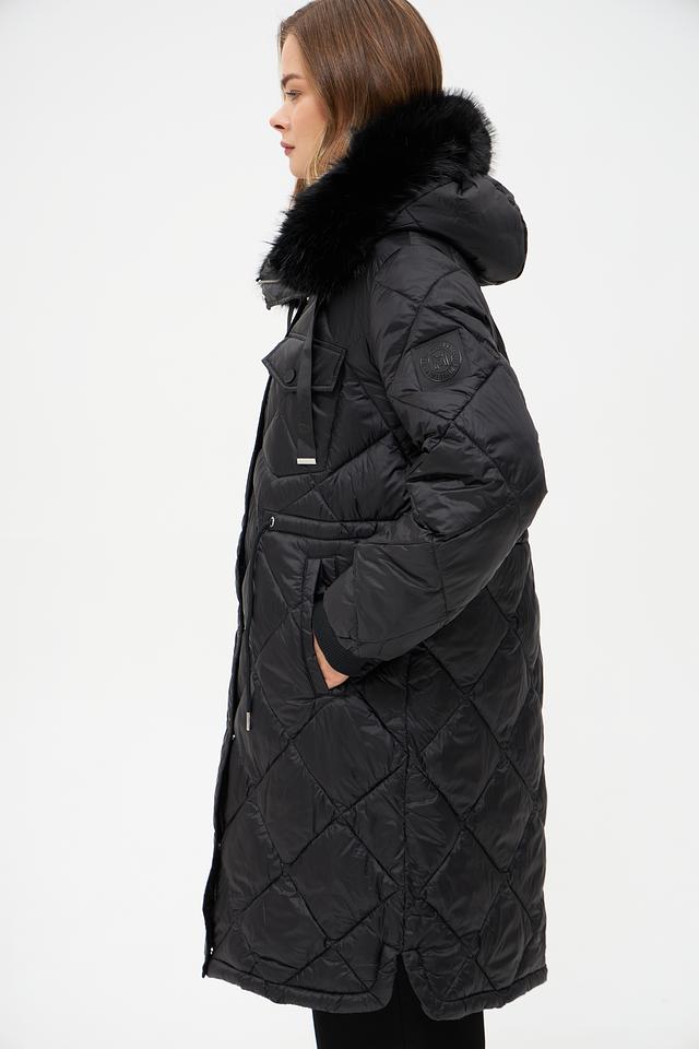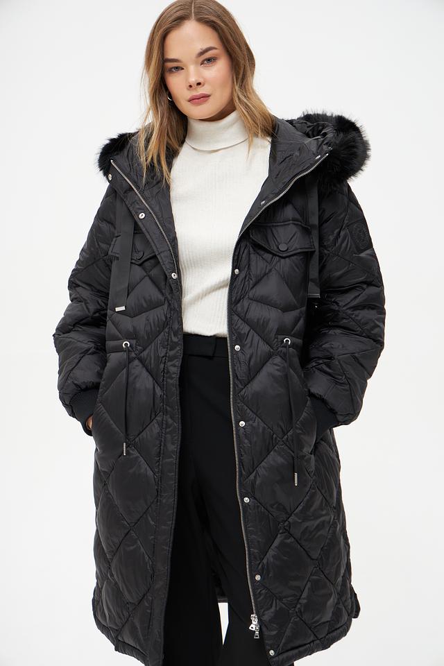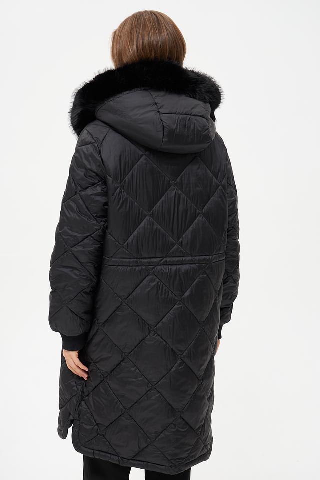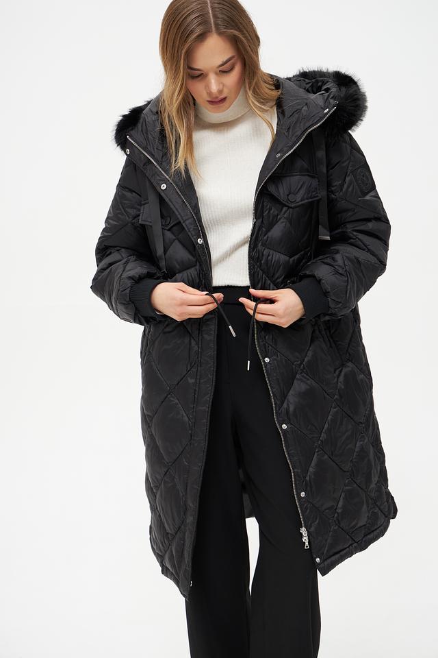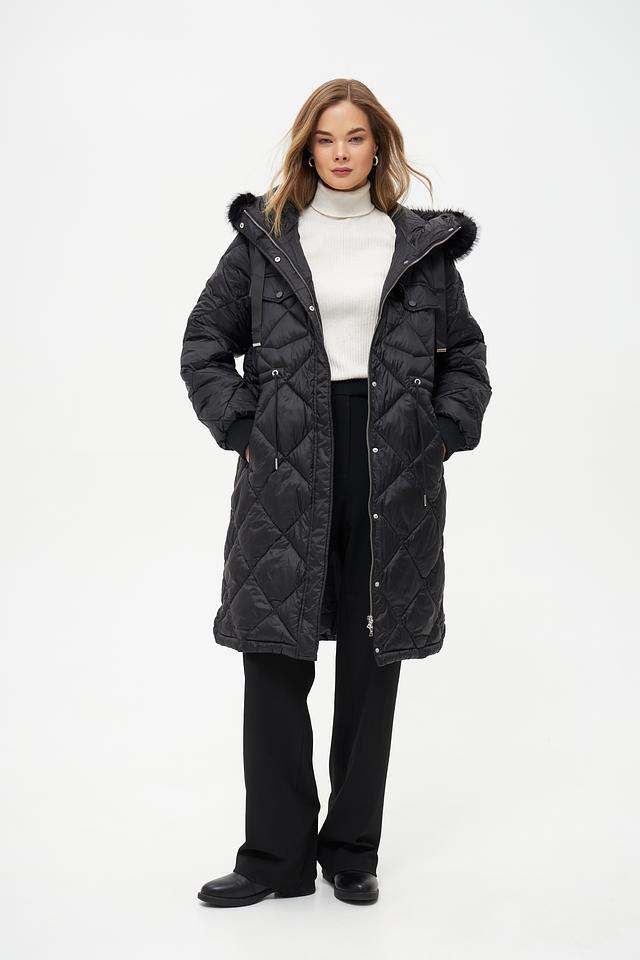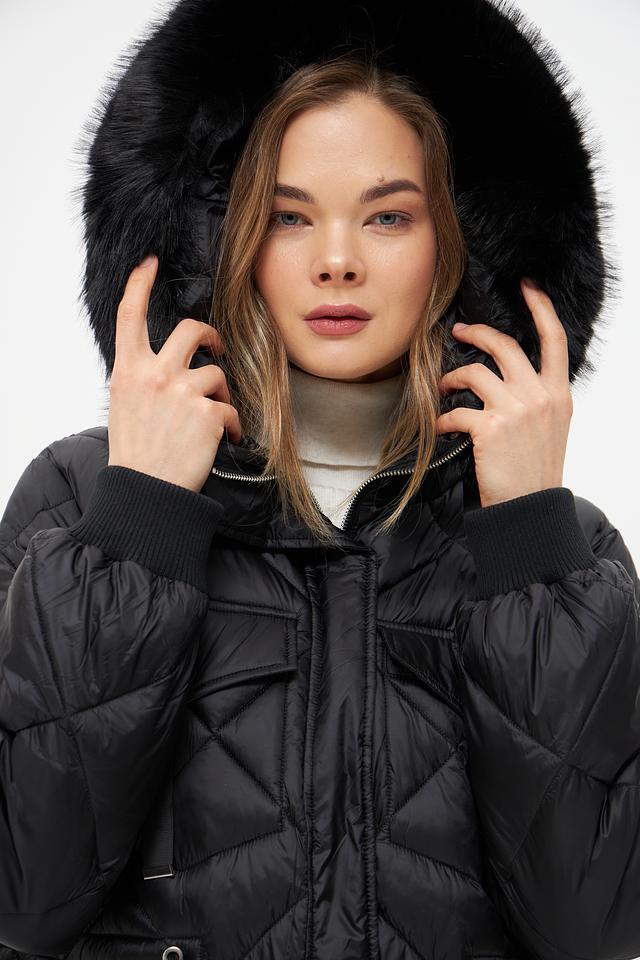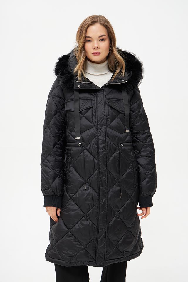 Модель имеет удлиненный силуэт и стеганую фактуру, которая придает ей современный вид. Капюшон дополнен отделкой из искусственного меха, обеспечивая дополнительную защиту от ветра и холода.