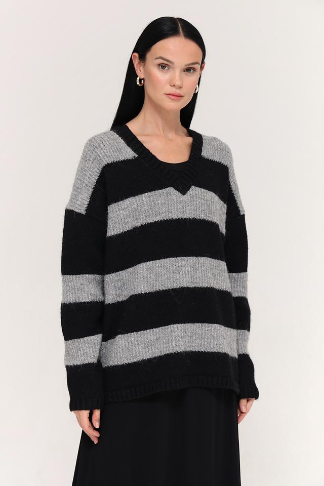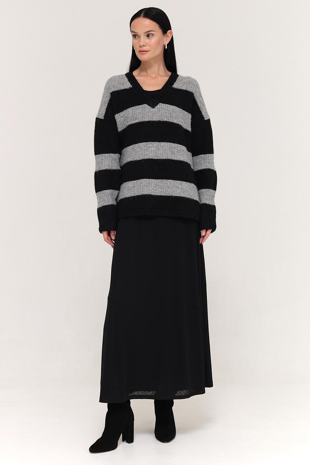 Основной цвет пуловера – чёрный, дополненный широкими горизонтальными полосами серого цвета. Такое сочетание делает его универсальным и легко сочетаемым с различными элементами одежды.