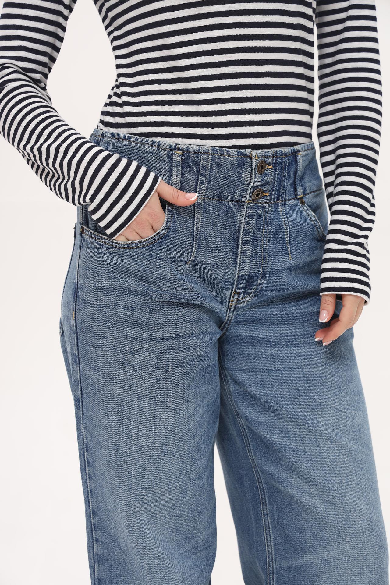 - Универсальность: Классический сине-голубой оттенок денима позволяет легко комбинировать эти джинсы с различными элементами гардероба, от базовых футболок до элегантных блузок, создавая разнообразные повседневные и casual образы.