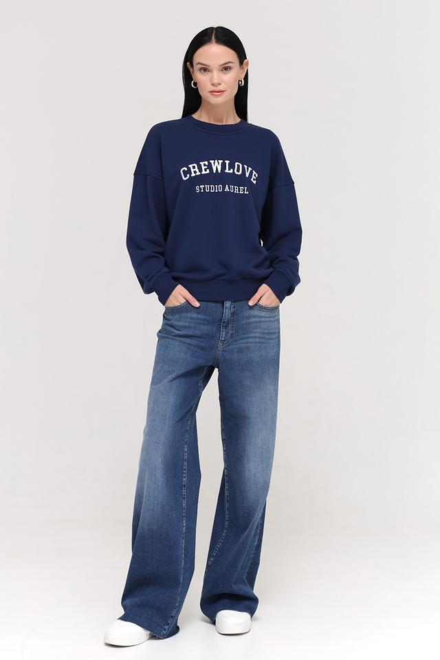 Модель имеет классический крой с круглым вырезом горловины и длинными рукавами. На передней части толстовки расположена яркая надпись "CREWLOVE STUDIO AUREL", выполненная в белом цвете, что придает ей особый стиль и индивидуальность.