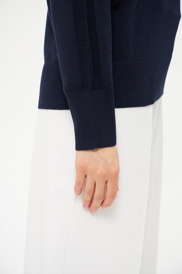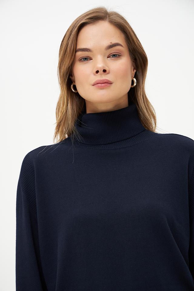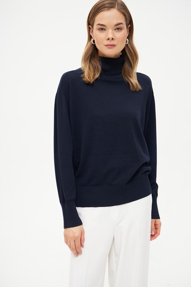 Тёмно-синий цвет делает эту водолазку универсальным элементом гардероба, который легко сочетается с другими вещами. Она идеально подходит для создания как повседневных, так и более формальных образов. Водолазку можно носить самостоятельно или в качестве базового слоя под пиджак или пальто.