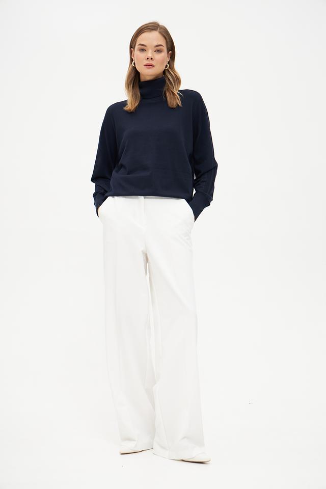Водолазка имеет классический прямой крой, который подходит для различных типов фигур. Высокий воротник-стойка добавляет элегантности и защищает от холода. Спущенные плечи придают модели расслабленный и современный вид.
