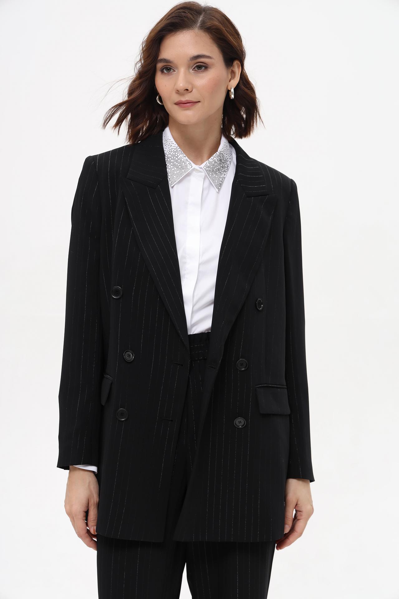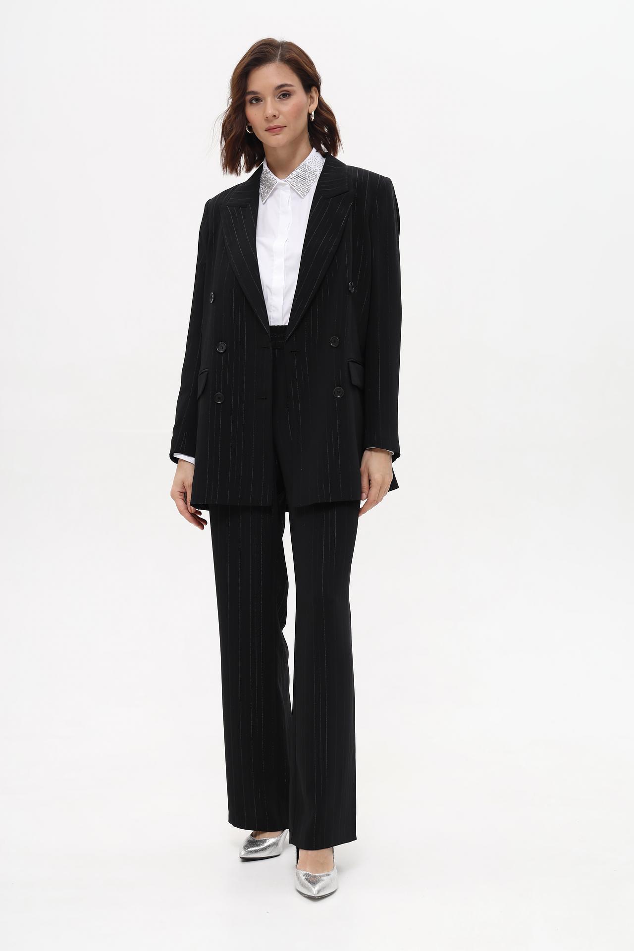 - Дизайн: Классический двубортный крой с отложными лацканами и вертикальной полоской создает строгий, но утонченный образ. Метализированная нить в составе ткани придает жакету деликатное мерцание, делая его особенно эффектным.