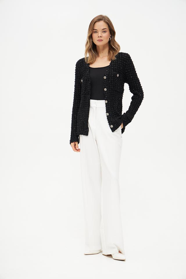 Состав ткани включает полиэстер, полиакрил, хлопок и полиамид, что обеспечивает комфорт в носке и долговечность изделия. Жакет идеально сочетается с брюками, юбками и платьями, создавая элегантный и современный образ.