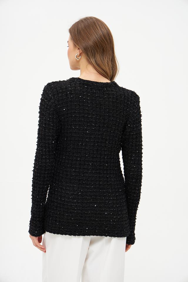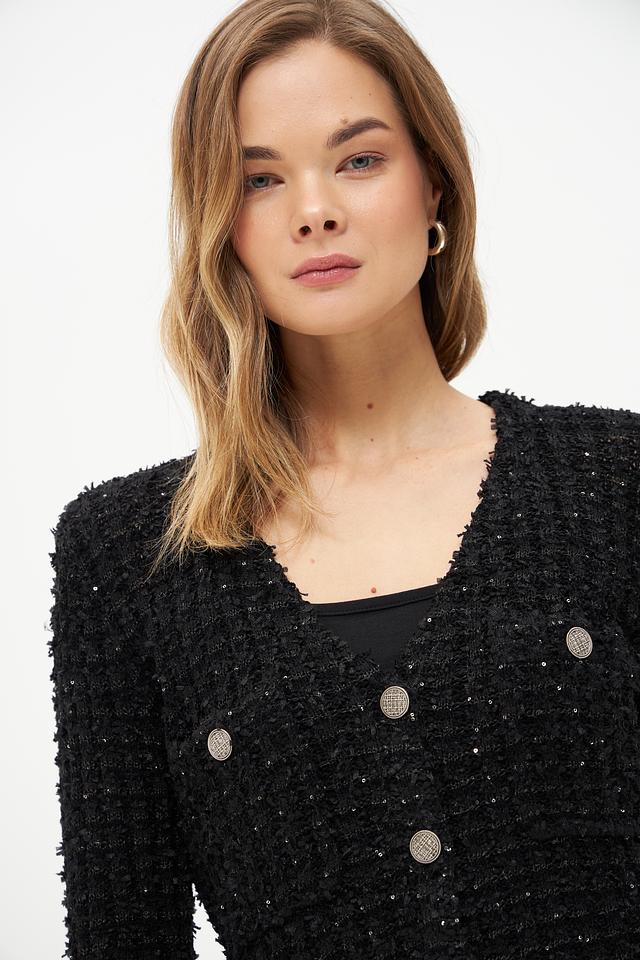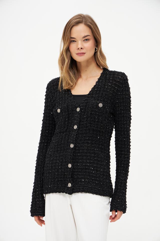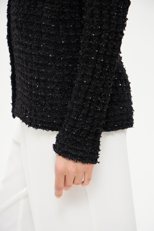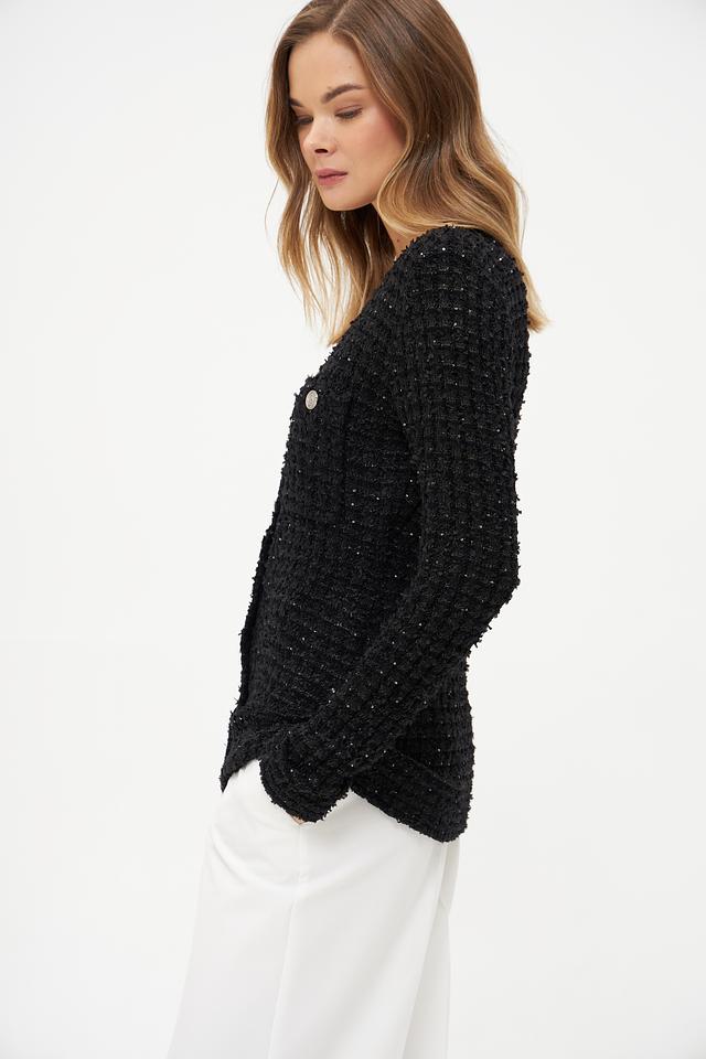 Чёрный жакет Marc Aurel из фактурной ткани с декоративными пуговицами. Модель застёгивается на пуговицы, имеет длинные рукава и приталенный силуэт. Состав: полиэстер 47%, полиакрил 29%, хлопок 14%, полиамид 10%