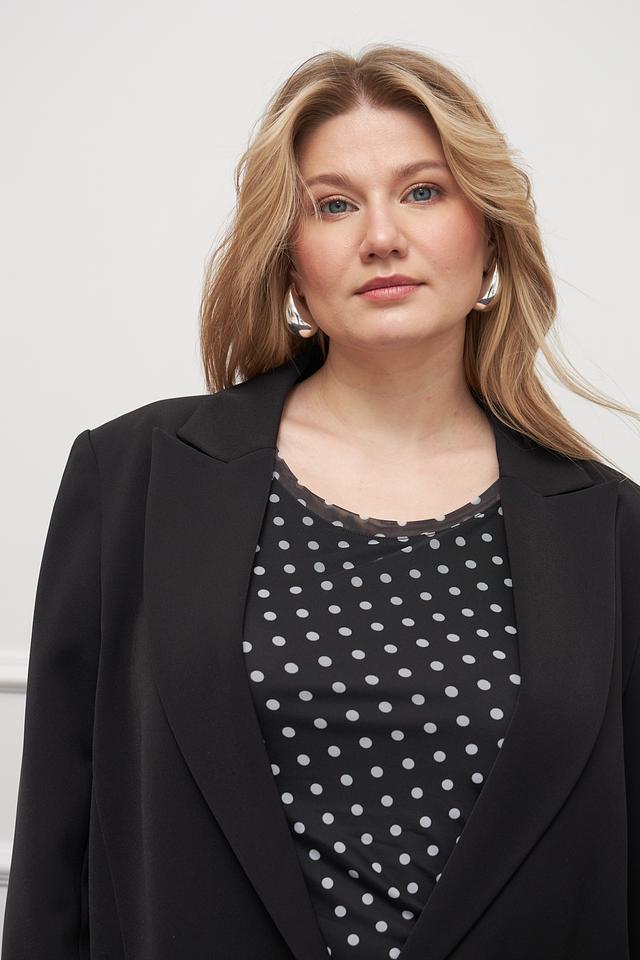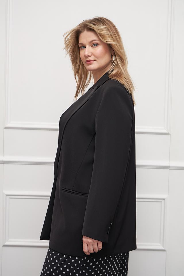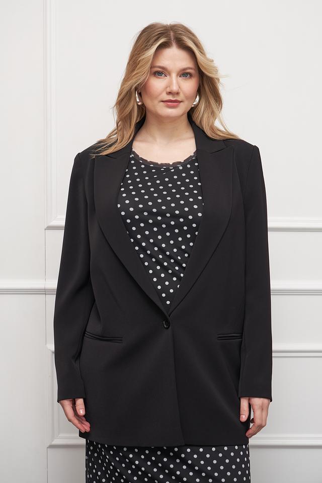 Этот жакет от Marc Aurel выполнен в классическом чёрном цвете и имеет свободный, оверсайз крой. Жакет застегивается на одну пуговицу, что придает ему элегантный вид.
