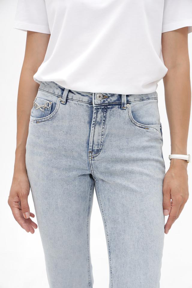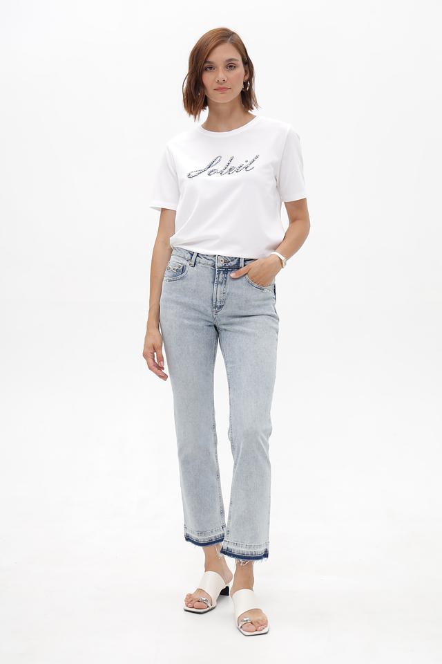 Джинсы имеют завышенную талию, которая подчеркивает фигуру и обеспечивает комфортную посадку. Необработанный край придает им современный и непринужденный вид. Пять карманов – два спереди и три сзади – обеспечивают функциональность.