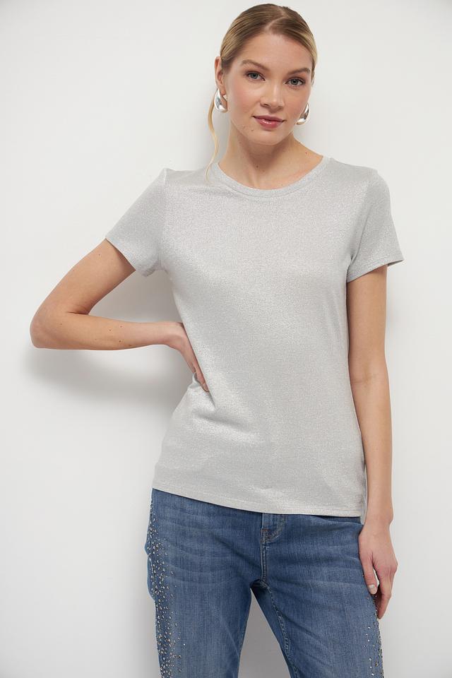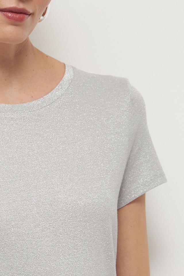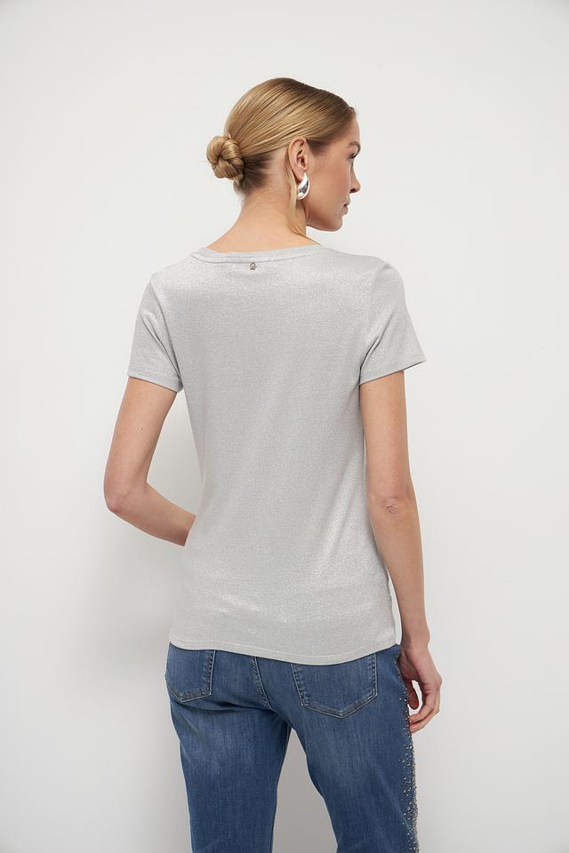 Женская футболка Marc Aurel серебристого цвета с добавлением металлизированной нити. Изготовлена из мягкой вискозы, обеспечивающей комфорт и приятные ощущения при носке. Стильный и элегантный вариант для создания повседневных образов. Состав: вискоза 65%, метализ.нить 35%