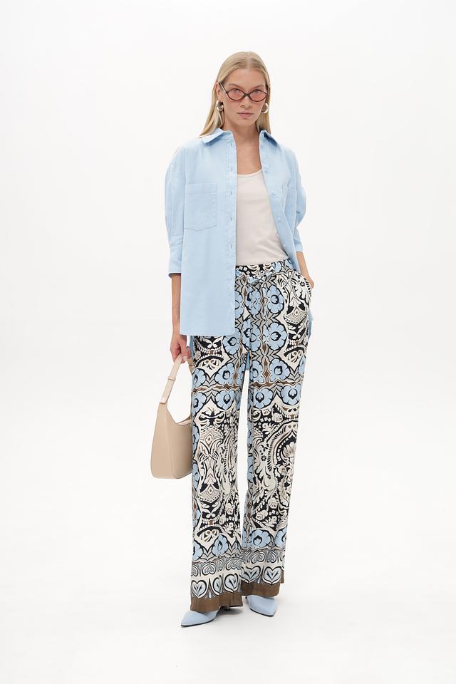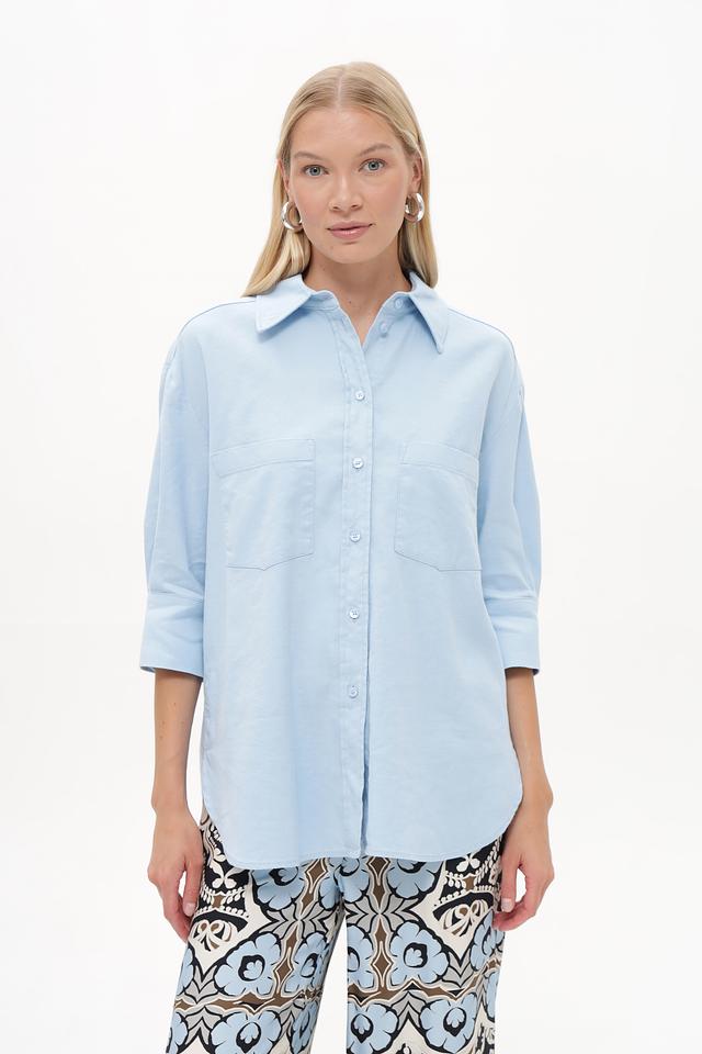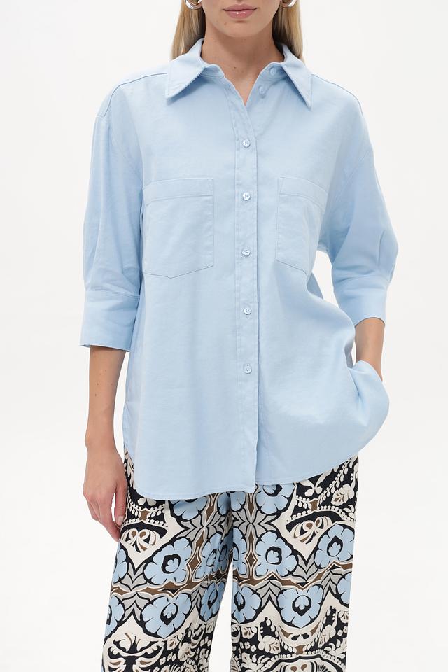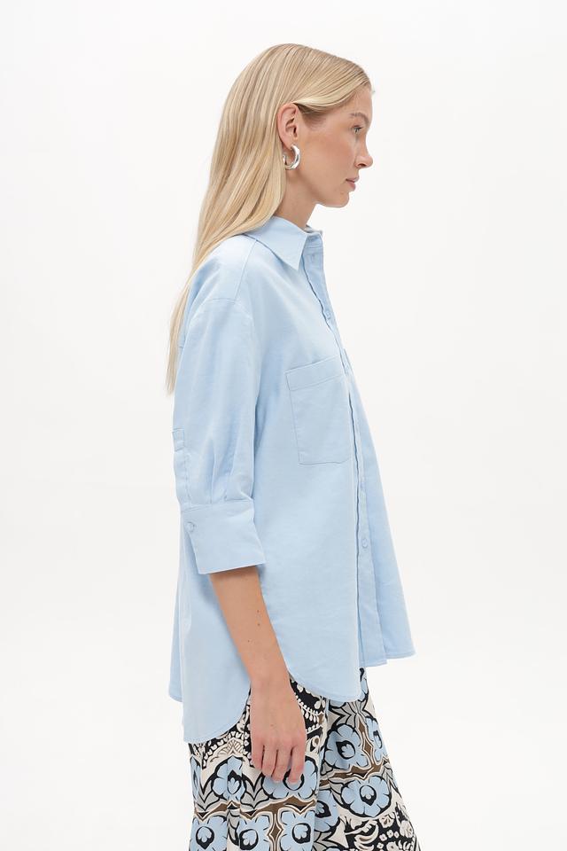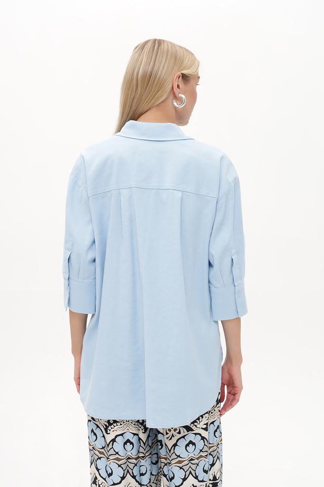 Классический воротник и застёжка на пуговицы придают блузе элегантный вид. Она прекрасно сочетается с брюками, джинсами или юбками, позволяя создавать разнообразные образы. Голубой цвет освежает и добавляет образу лёгкости.