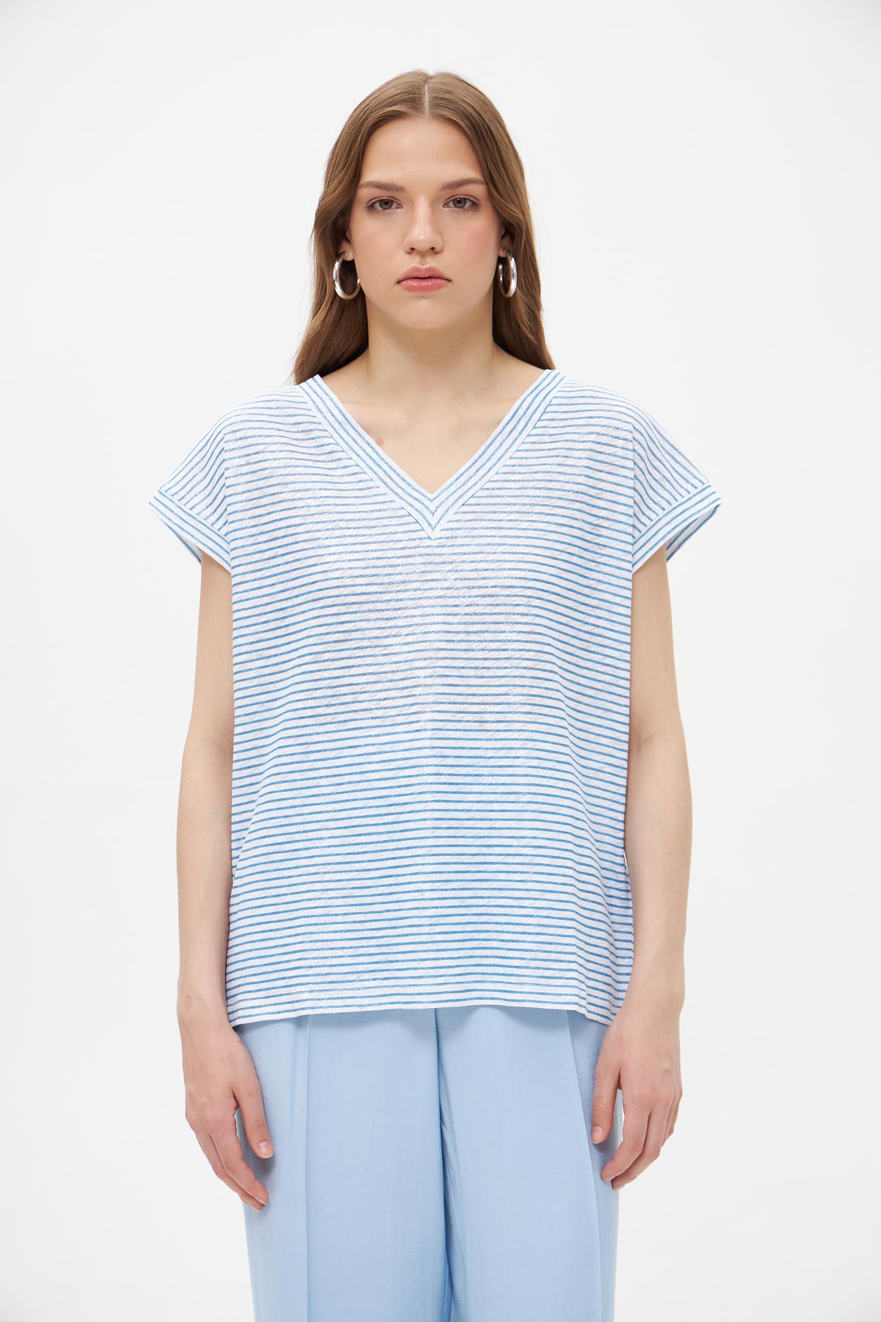 Изделие выполнено в классическом стиле с V-образным вырезом и короткими рукавами, что добавляет ему лёгкости и женственности.