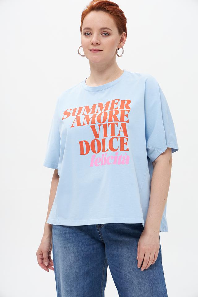 Основным акцентом этой модели является яркий принт с надписями “SUMMER AMORE VITA DOLCE felicita”, выполненный в розовых и коричневых тонах. На задней части футболки расположен небольшой принт “XOXO”. Такой дизайн добавит игривости и индивидуальности вашему образу.
