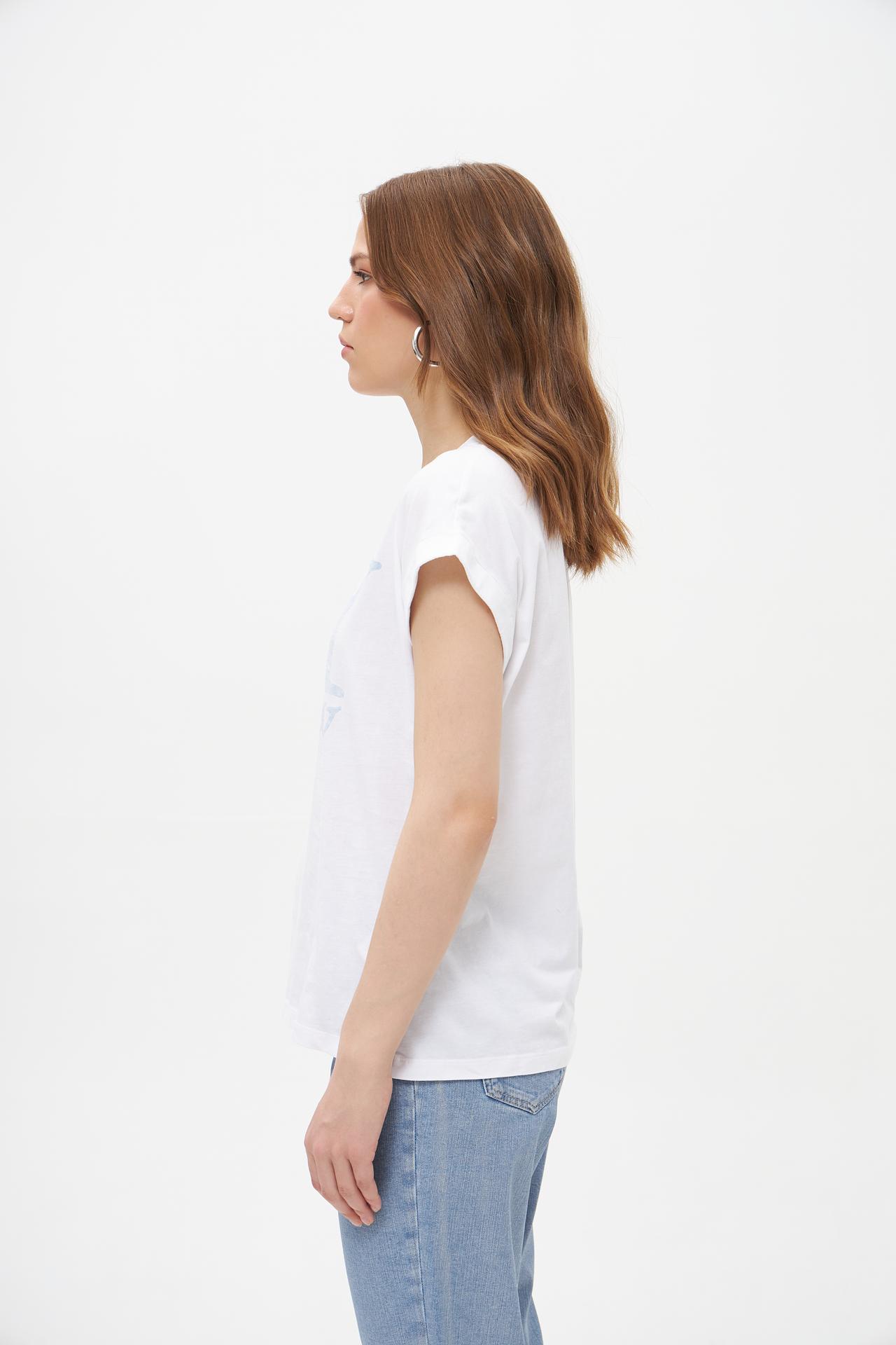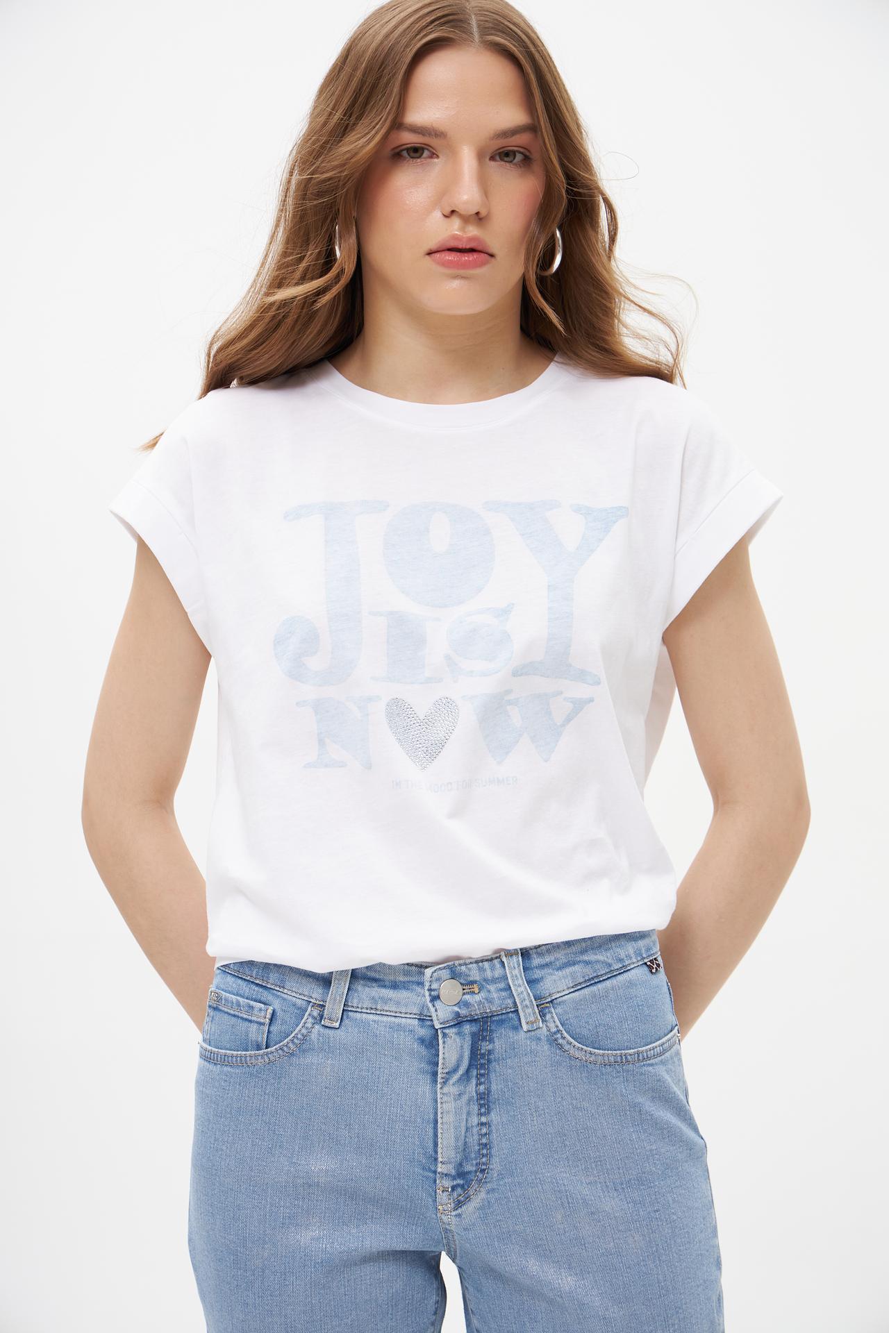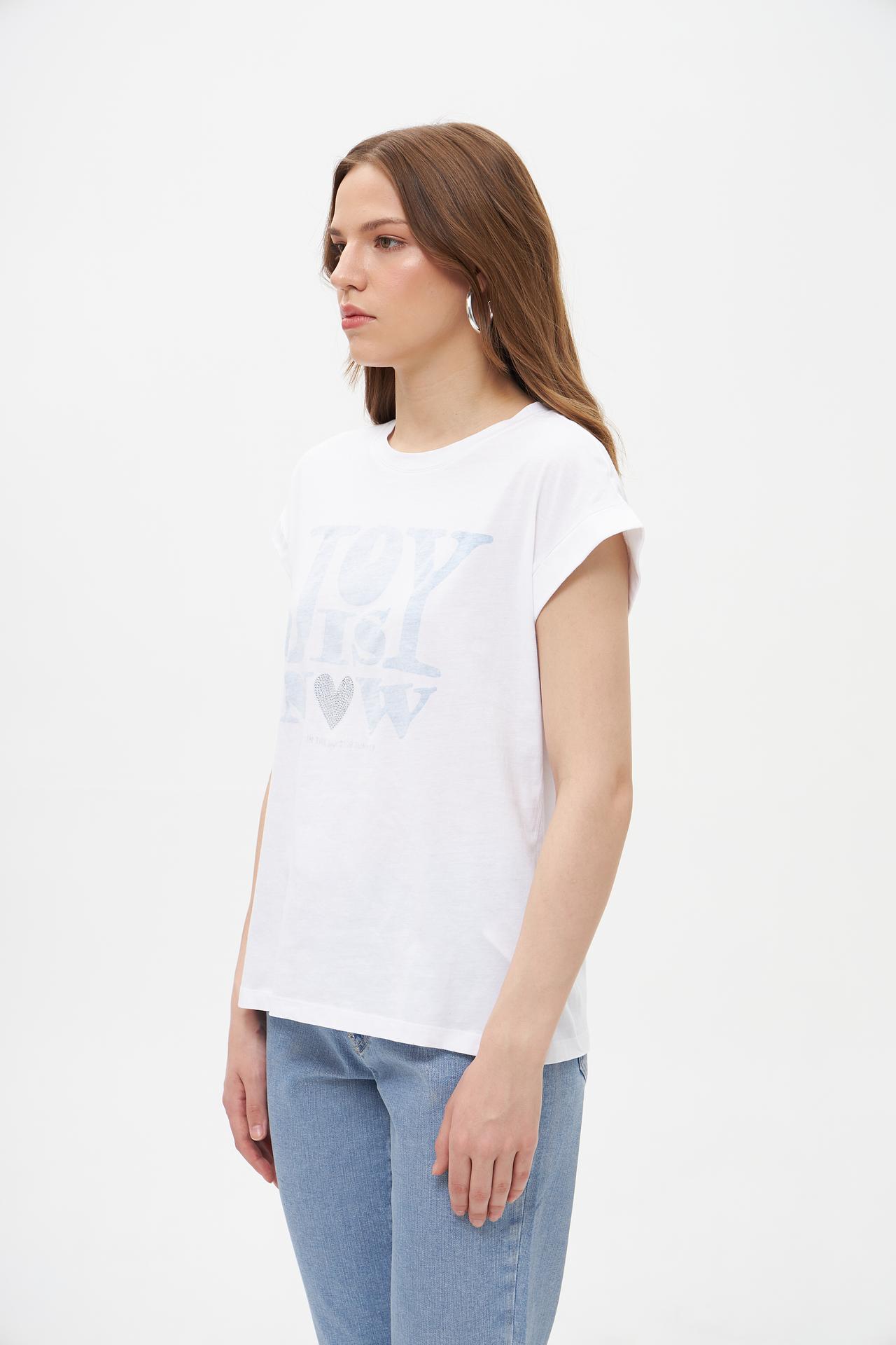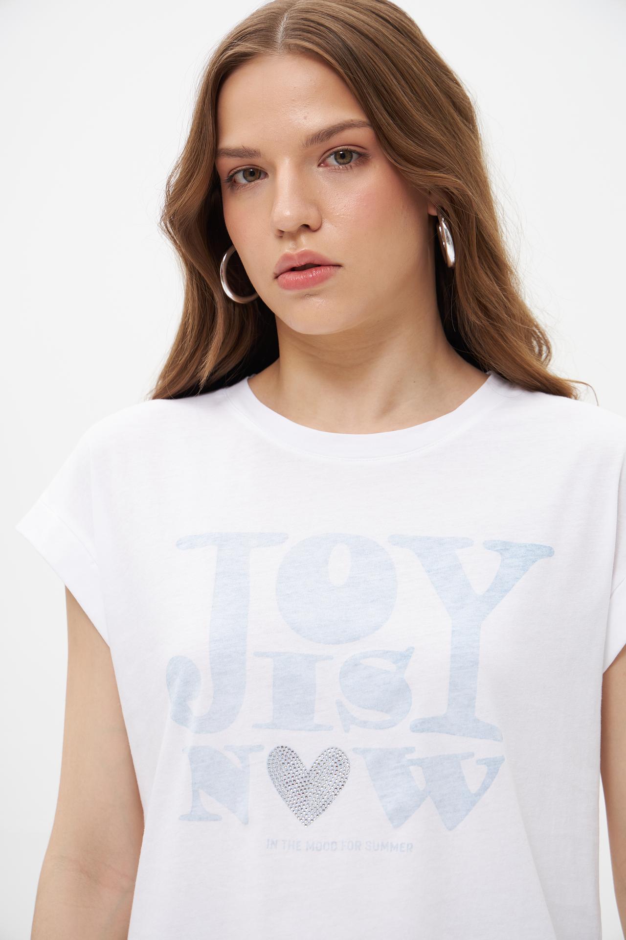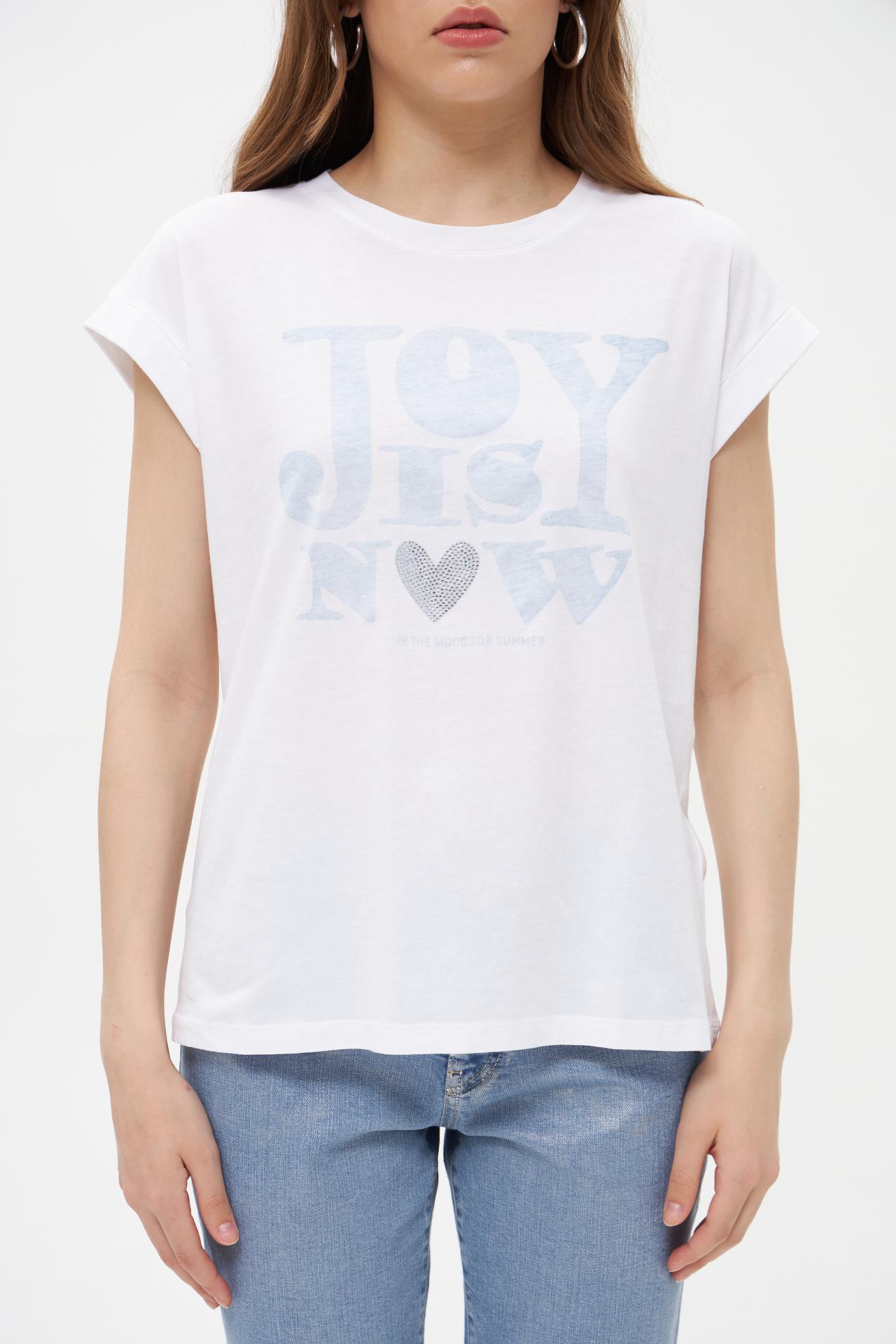 Модель украшена стильным принтом "JOY IS NOW" с декоративным сердцем из переливающихся страз, добавляющим изысканности образу. Укороченный рукав с отворотом и округлый вырез подчеркивают женственность и актуальность дизайна.