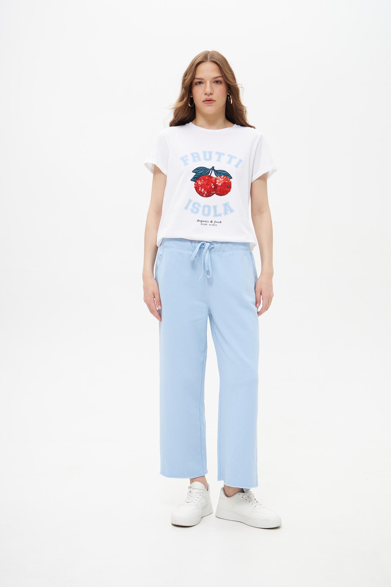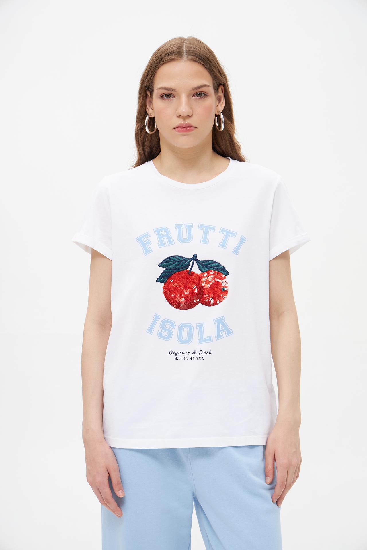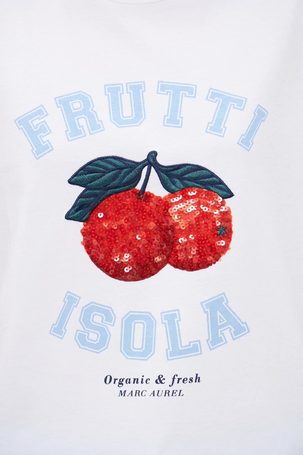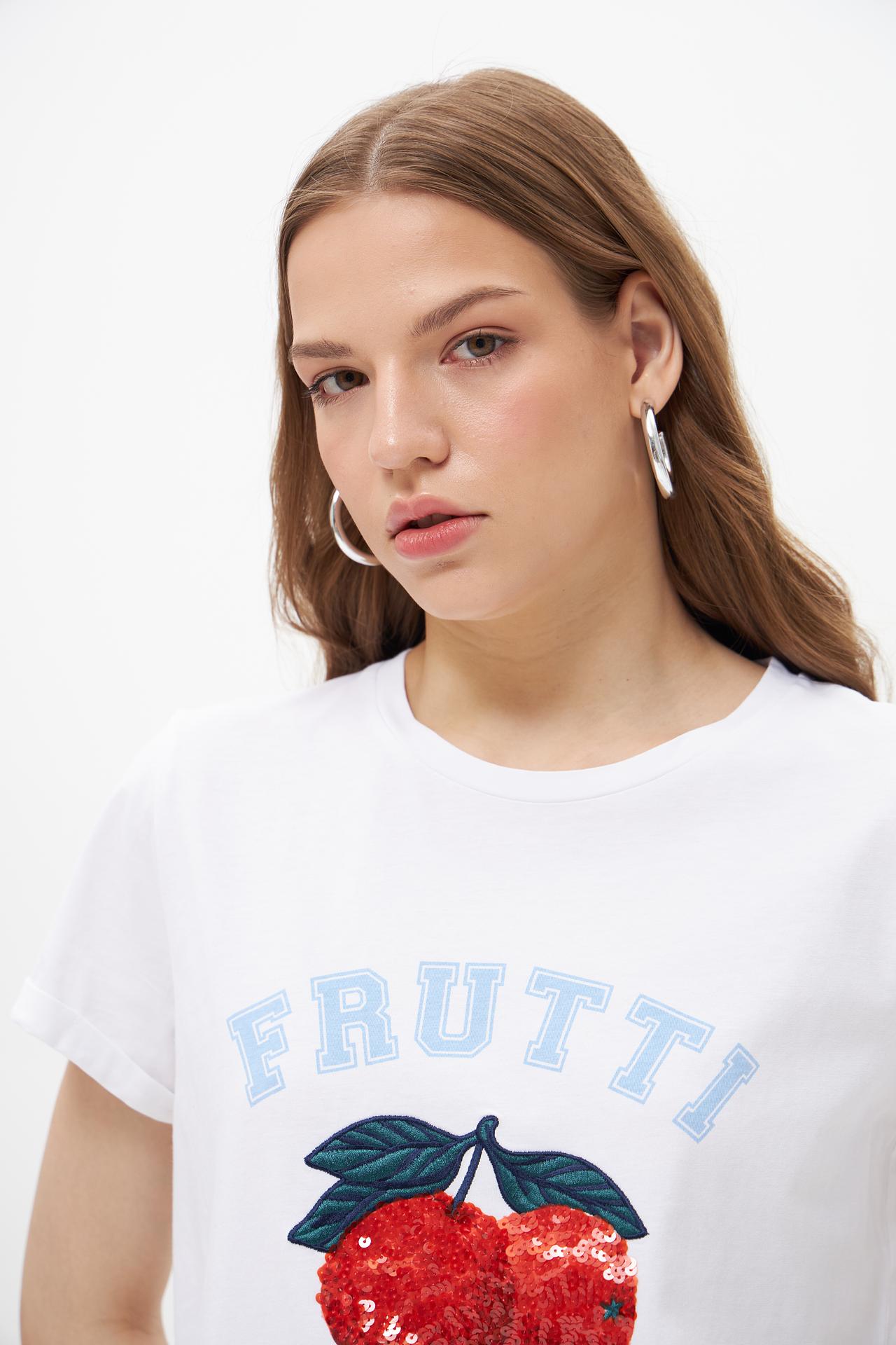 Изображение фруктов с пайетками на груди добавляет игривый акцент, делая футболку уникальной. Футболка подойдет для создания модных и запоминающихся образов. Идеальный выбор для тех, кто ценит качество и оригинальность.