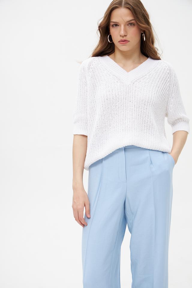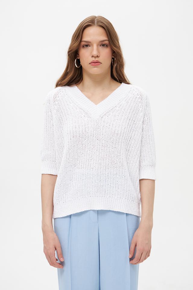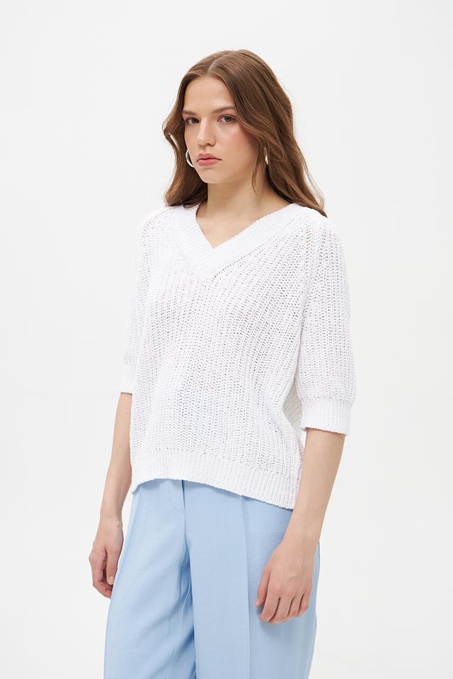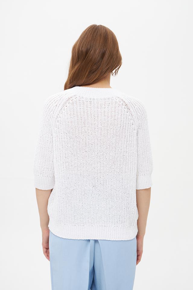 Пуловер отличается лёгкой, воздушной текстурой благодаря особому плетению. Короткие рукава делают его идеальным выбором для тёплой погоды или для создания многослойных образов. Белый цвет пуловера легко сочетается с любой одеждой и аксессуарами.