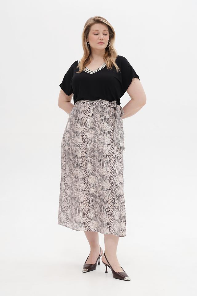 Юбка имеет длину миди и свободный крой, обеспечивающий комфорт при носке. Модель дополнена поясом-завязкой, который позволяет подчеркнуть талию и создать желаемый силуэт. Благодаря составу из модала и полиамида, юбка обладает приятной текстурой, хорошо драпируется и не требует особого ухода.