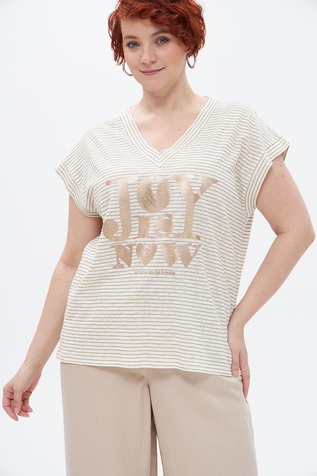 Передняя часть футболки украшена крупной золотистой надписью, добавляющей образу изысканности и стиля. V-образный вырез горловины и укороченные рукава делают силуэт более легким и женственным.