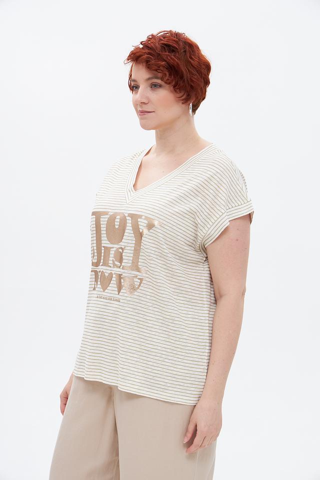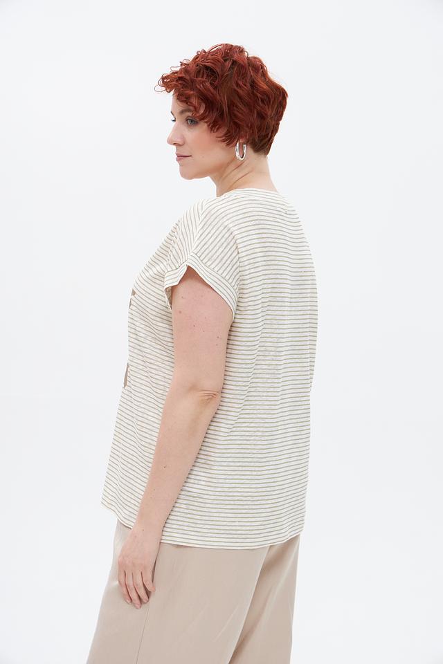 Бежевая футболка Marc Aurel с полосатым принтом и золотистой надписью. Изготовлена из натурального льна с добавлением хлопка, обеспечивающего комфорт и воздухопроницаемость. Состав: лен 70%, хлопок 30%