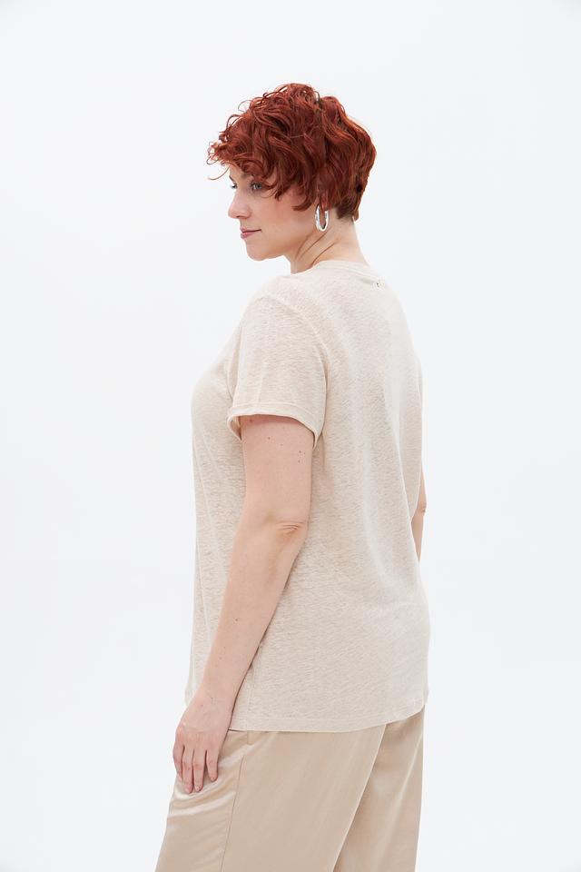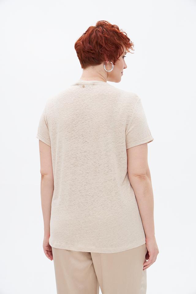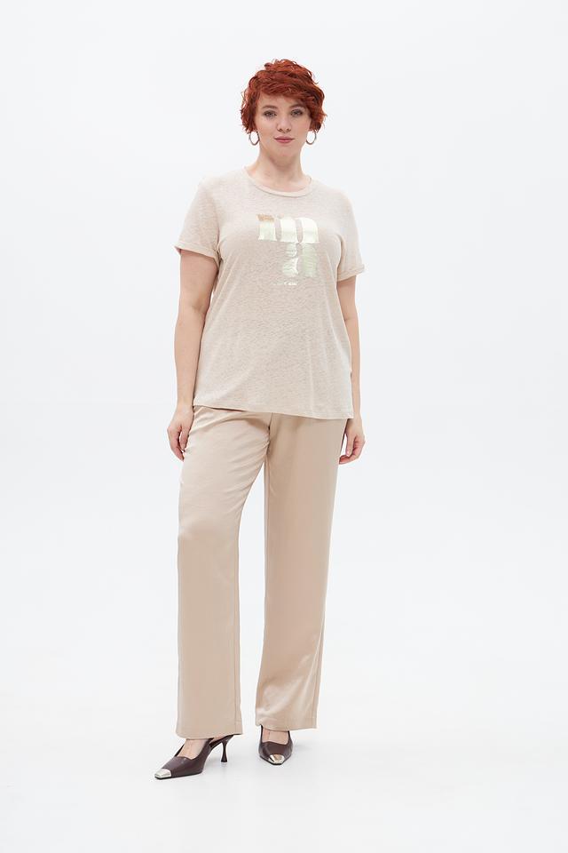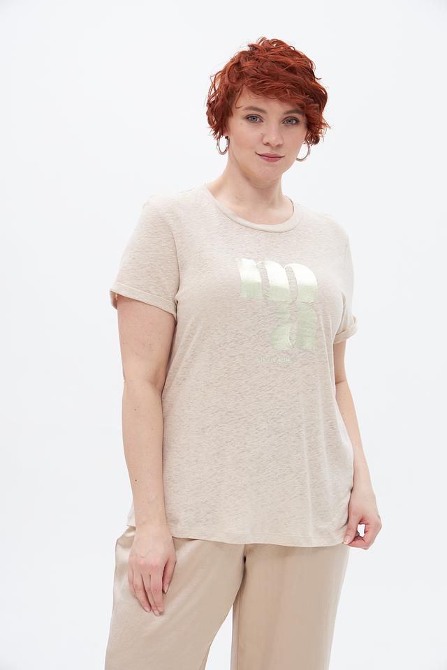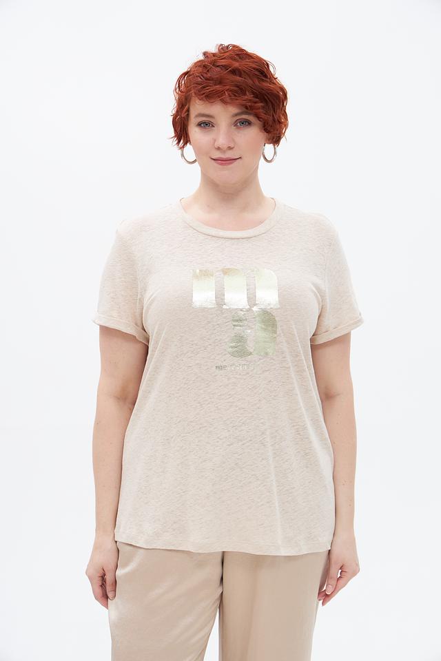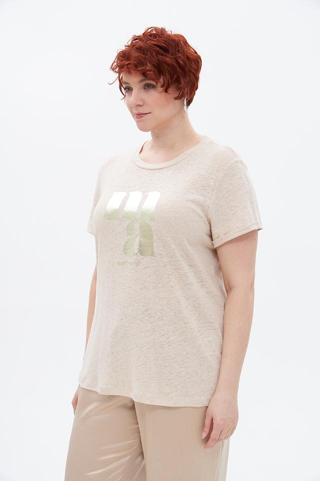 Бежевая футболка Marc Aurel свободного кроя с оригинальным принтом. Изготовлена из натурального льна с добавлением хлопка, обеспечивающего комфорт и воздухопроницаемость. Состав: лен 70%, хлопок 30%