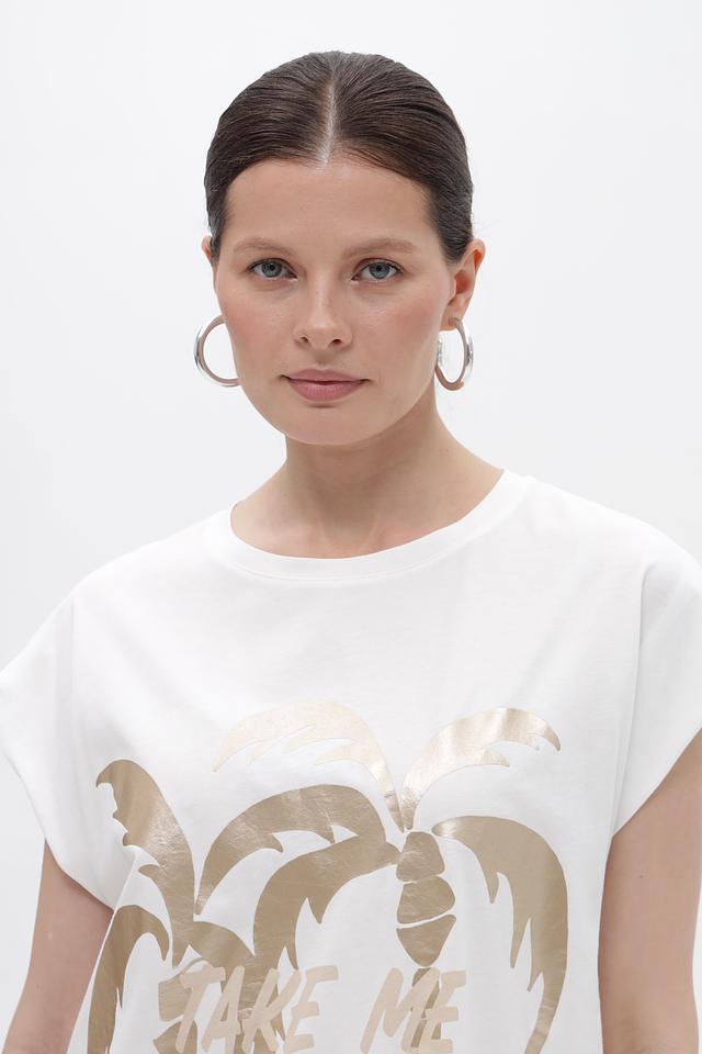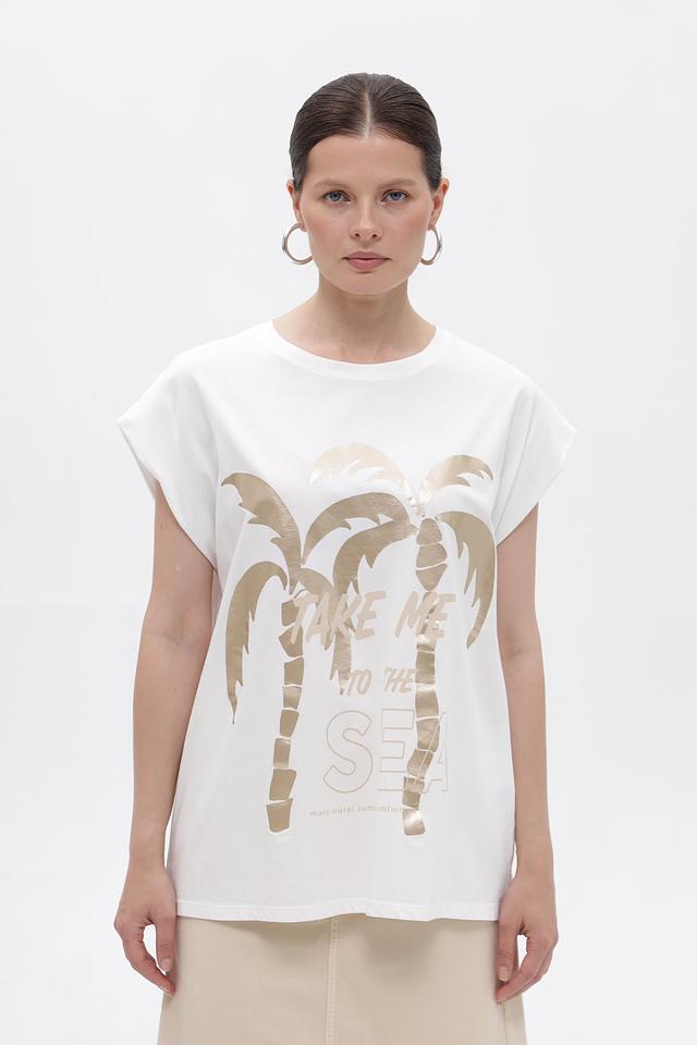 Футболка имеет свободный крой, который не сковывает движений и позволяет создать расслабленный образ. Короткие рукава-крылышки добавляют модели легкости и оригинальности. На передней части футболки расположен эффектный золотистый принт с изображением пальм, что придает ей летнее настроение.