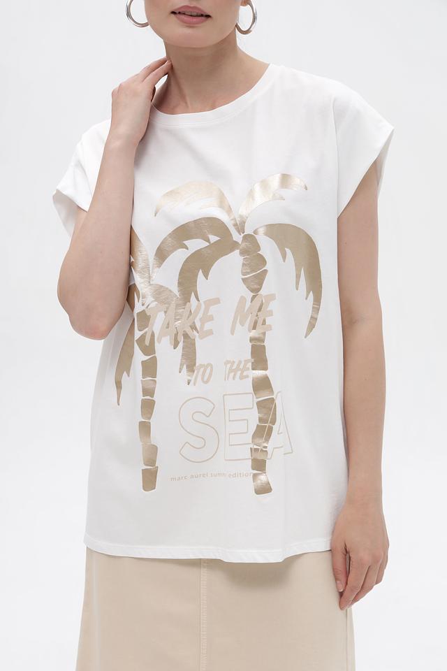 Белая футболка Marc Aurel с золотистым принтом в виде пальм. Модель из 100% хлопка отличается свободным кроем и короткими рукавами-крылышками, что обеспечивает комфорт в жаркую погоду. Состав: хлопок 100%