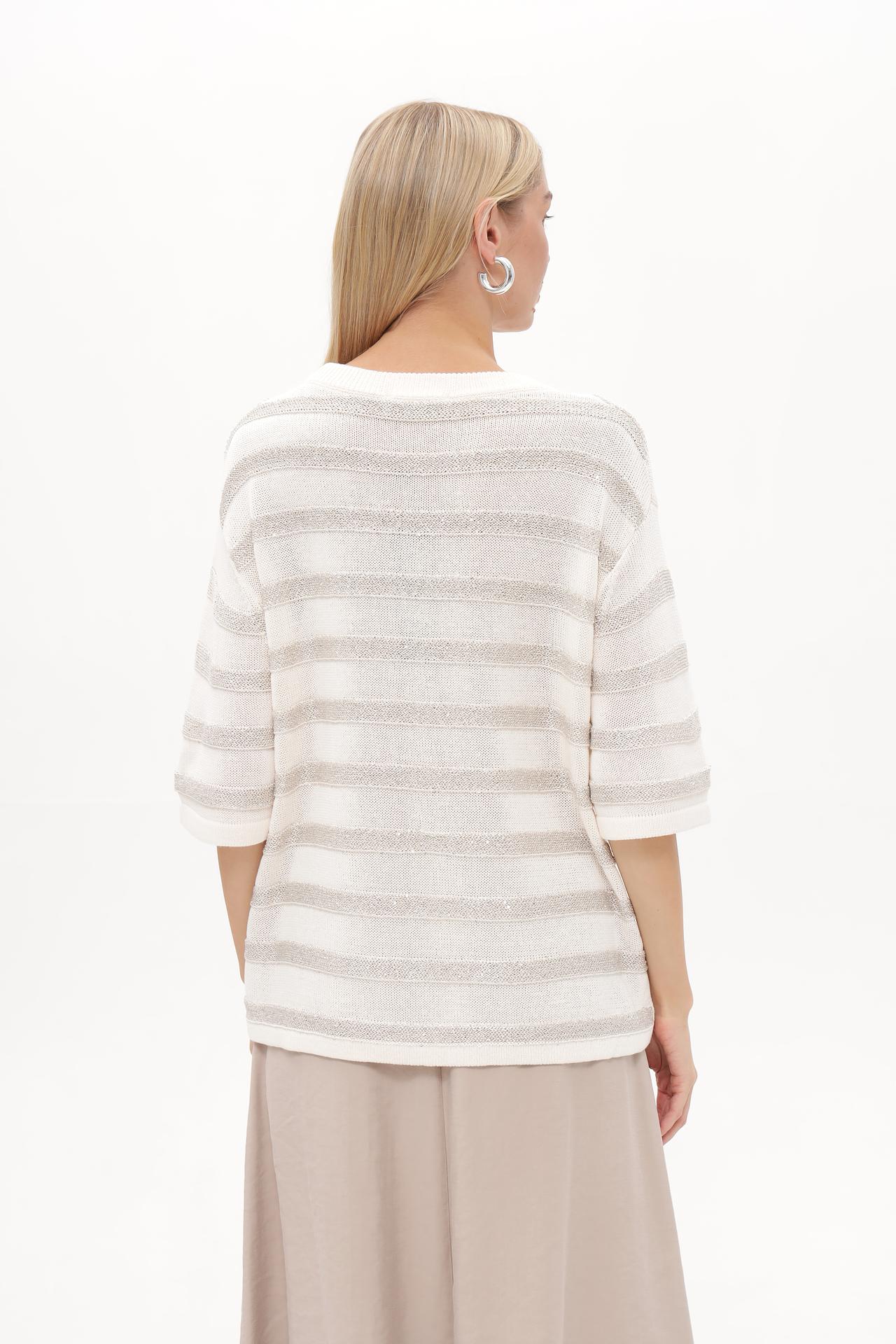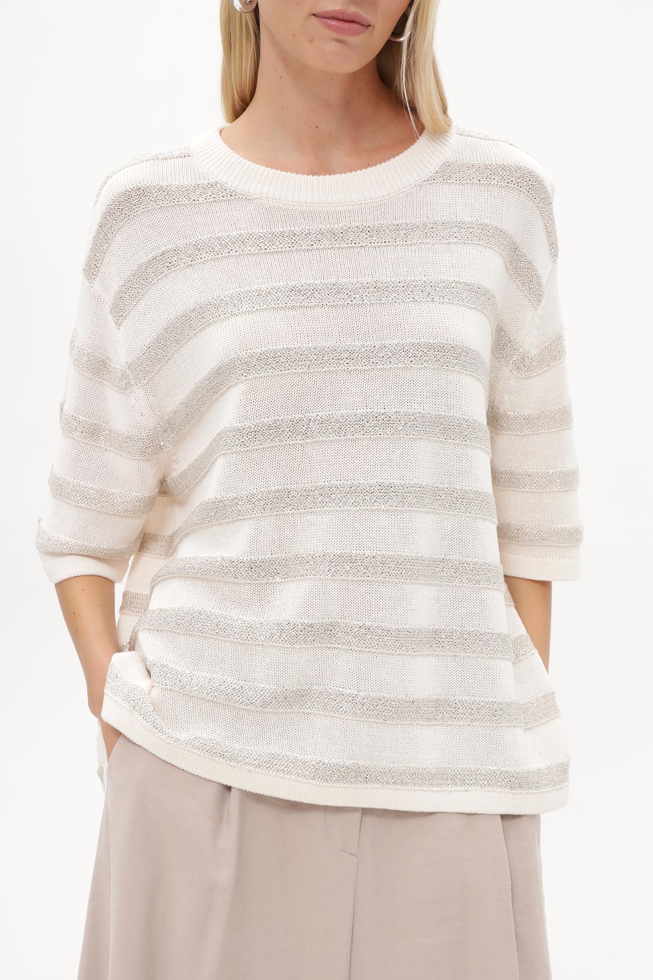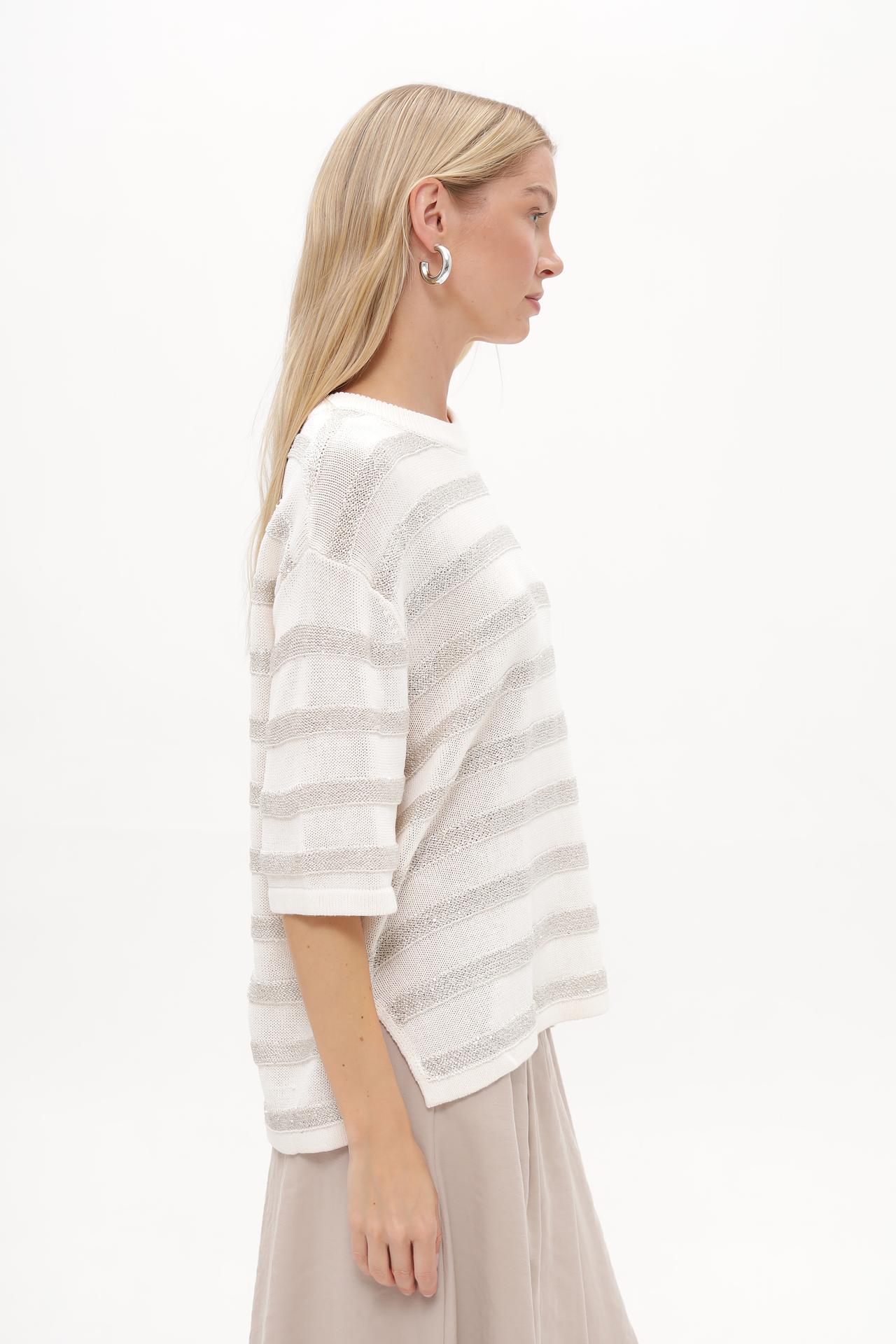- Дизайн: Модный пуловер выполнен в белом цвете с эффектными горизонтальными серебристыми полосами, придающими изделию современный вид. Свободный крой и рукава длиной 3/4 обеспечивают расслабленную и элегантную посадку.