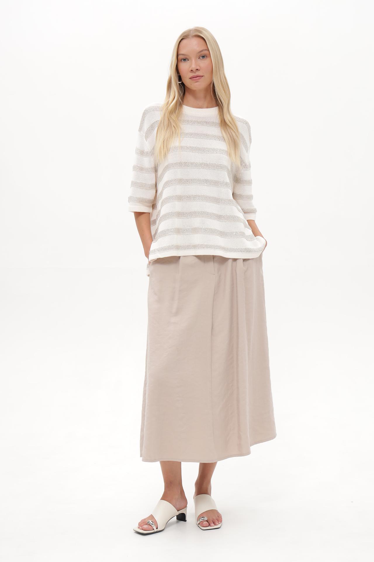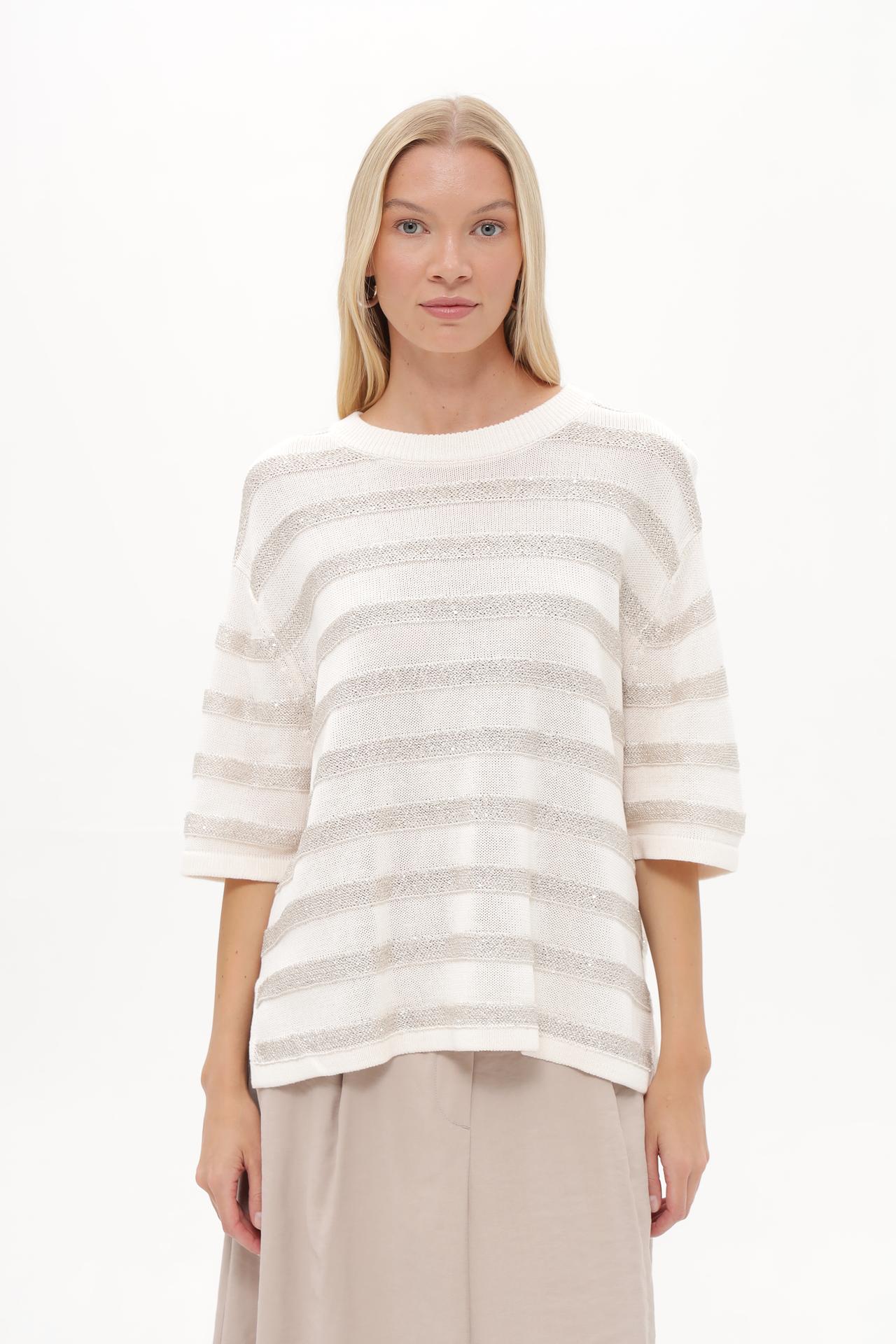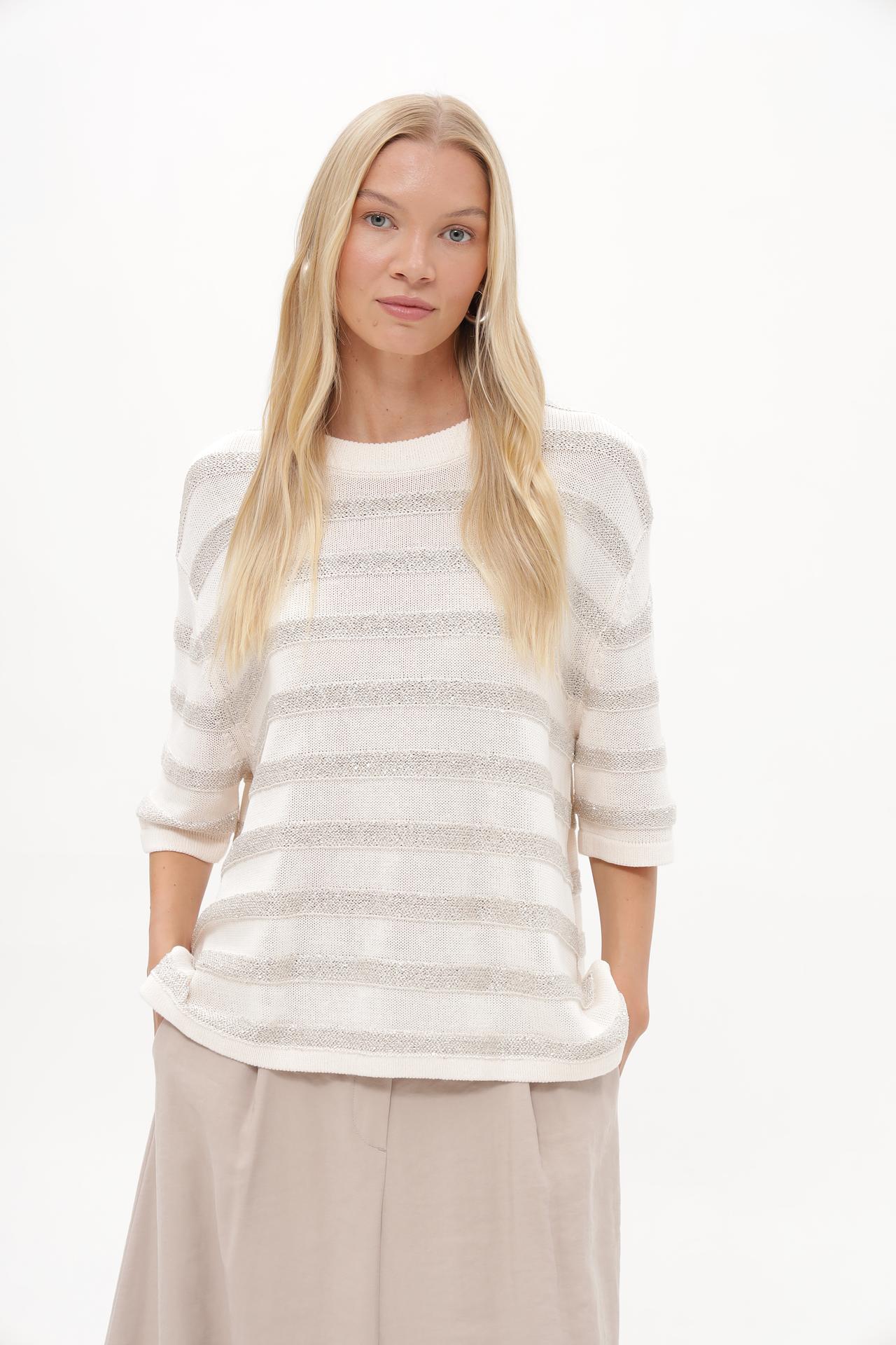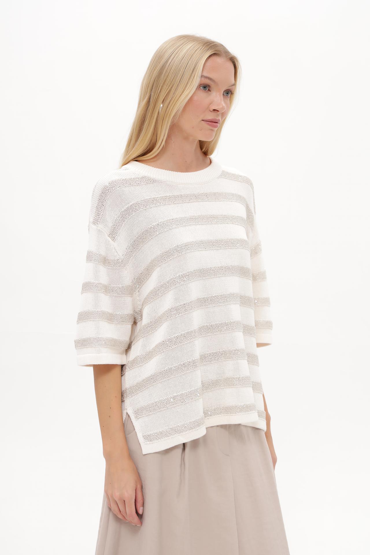 - Дизайн: Модный пуловер выполнен в белом цвете с эффектными горизонтальными серебристыми полосами, придающими изделию современный вид. Свободный крой и рукава длиной 3/4 обеспечивают расслабленную и элегантную посадку.
