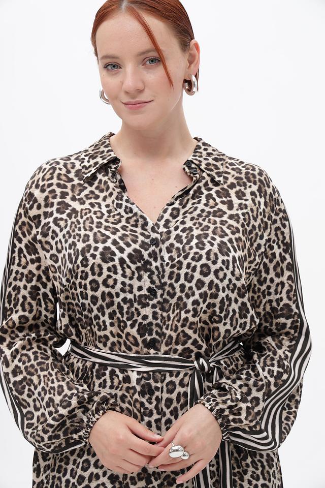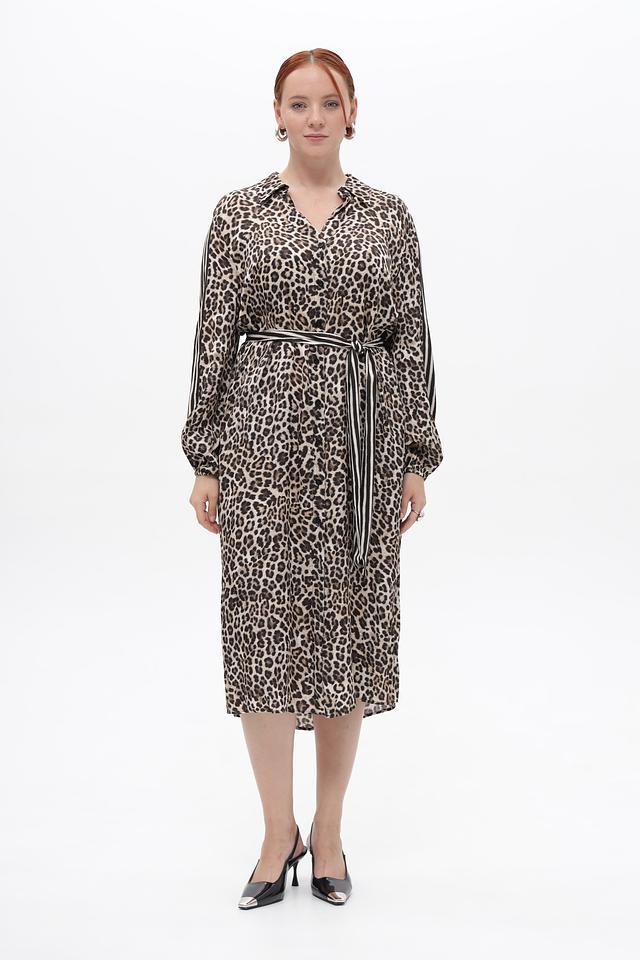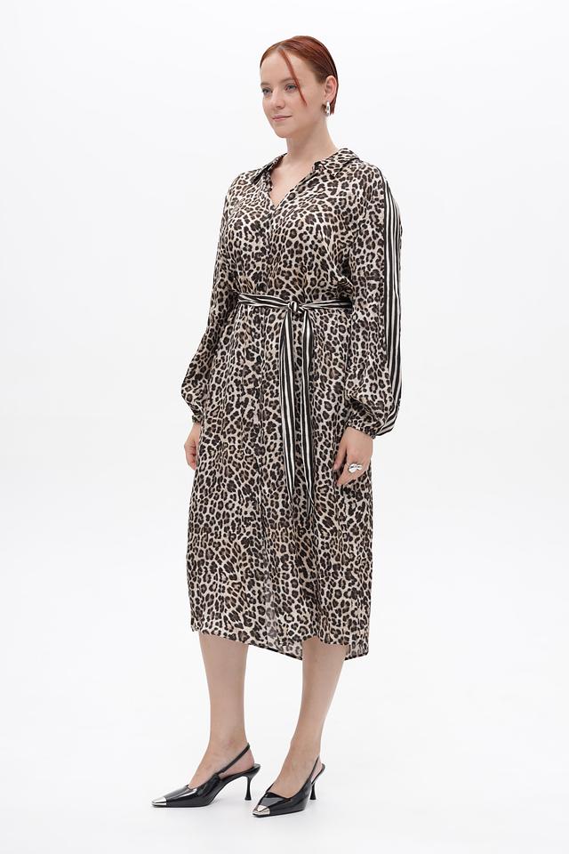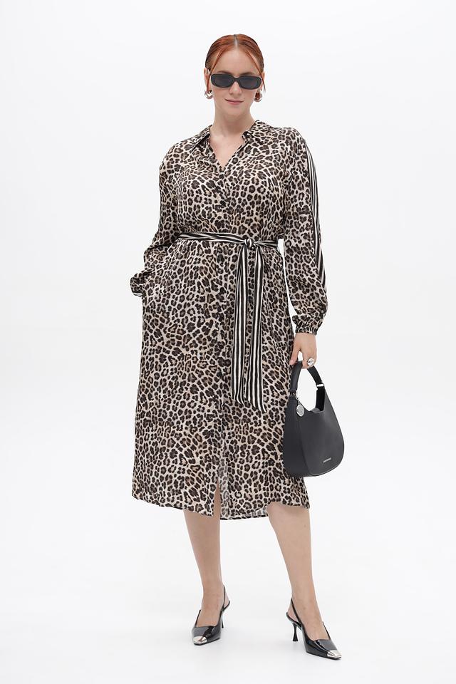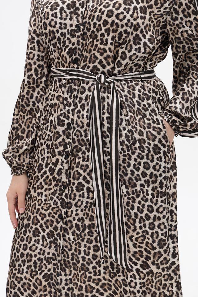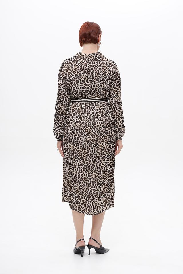 Платье выполнено в коричневом цвете с ярким леопардовым принтом. Длинные рукава дополнены манжетами с полосками. V-образный вырез подчеркивает женственность силуэта.