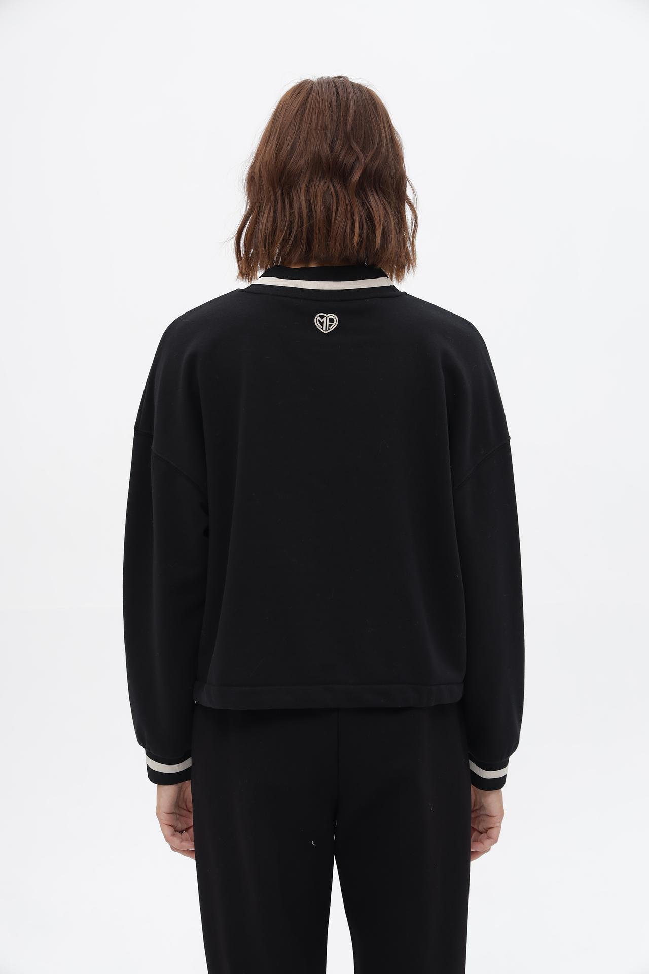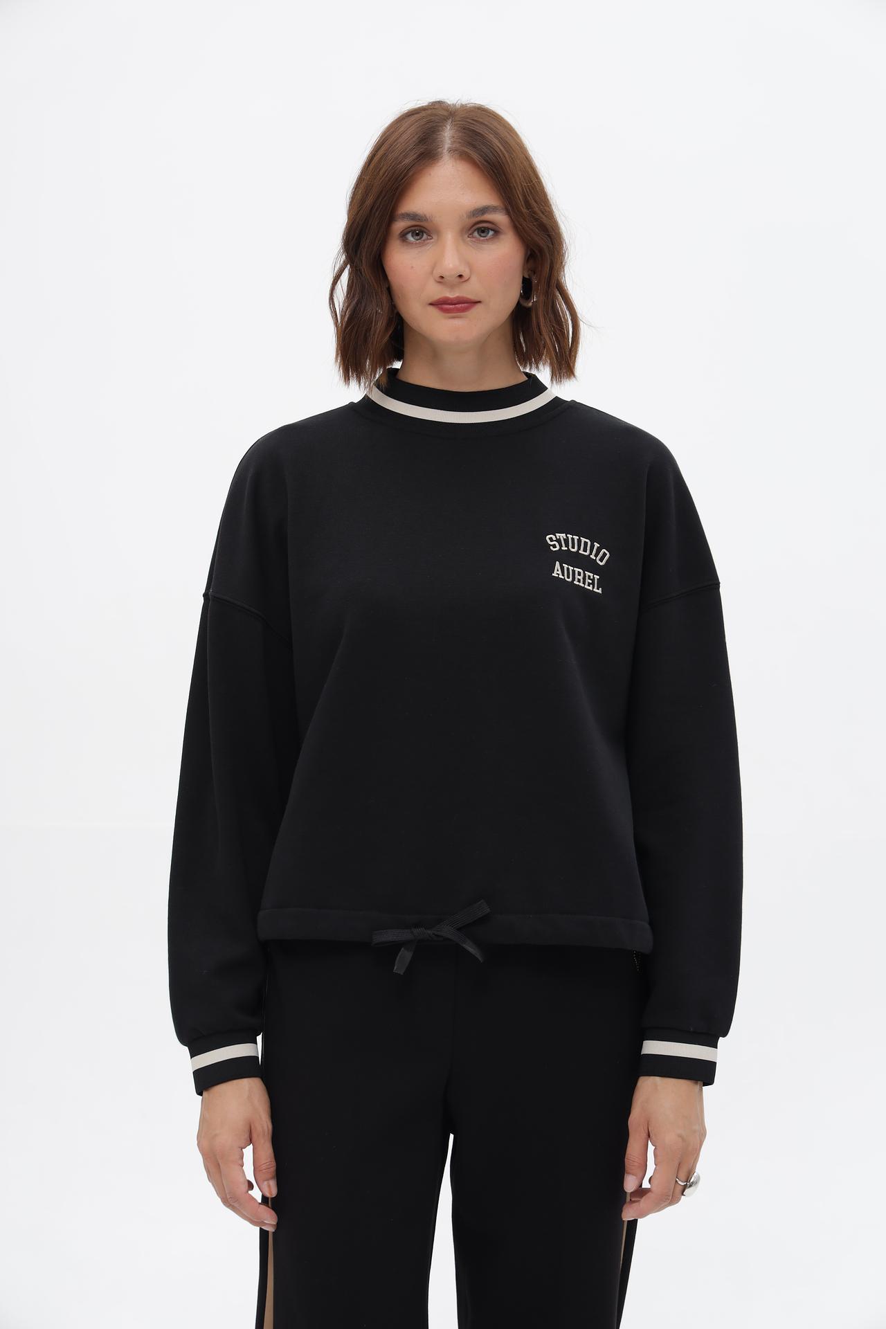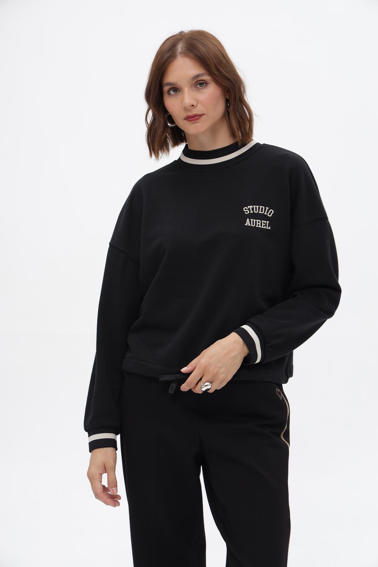 - Дизайн и детали: Классический крой с круглым воротником и длинными рукавами. Декоративные элементы включают вышивку "STUDIO AUREL" на груди и контрастные трикотажные манжеты и воротник с полосами. Низ изделия регулируется шнурком для создания индивидуального силуэта.
