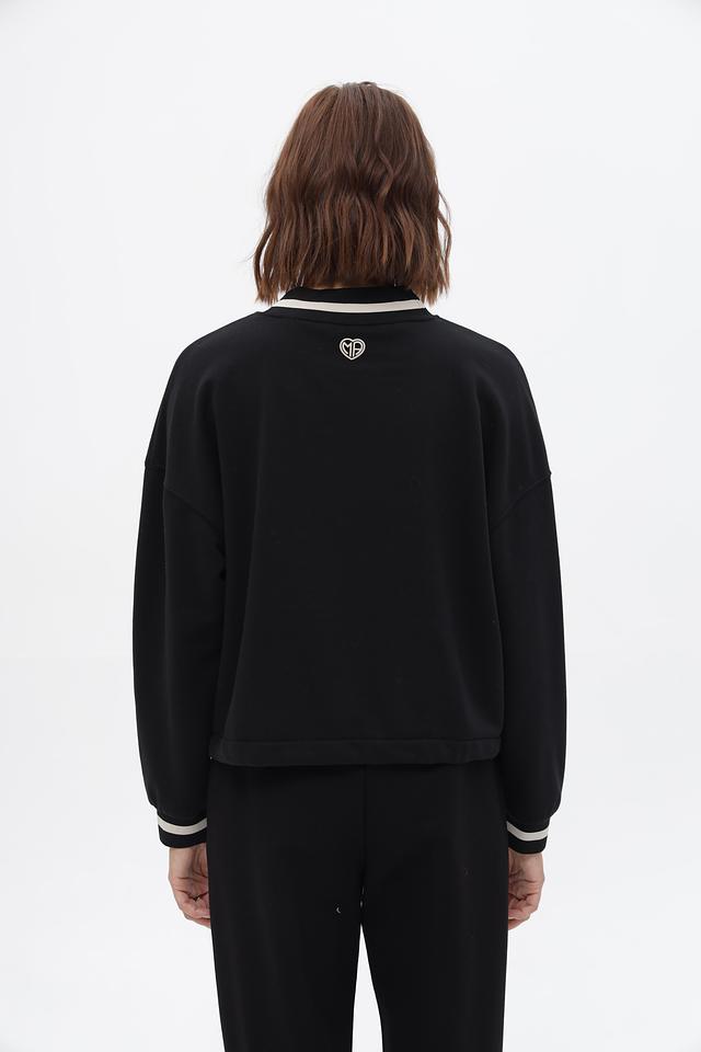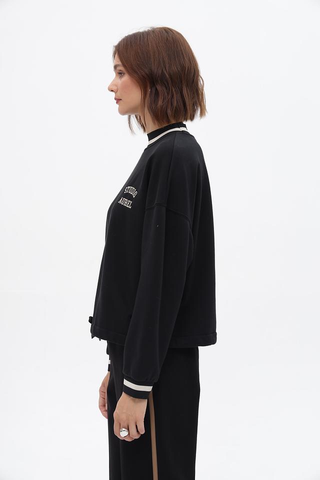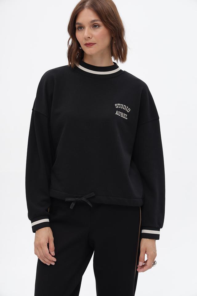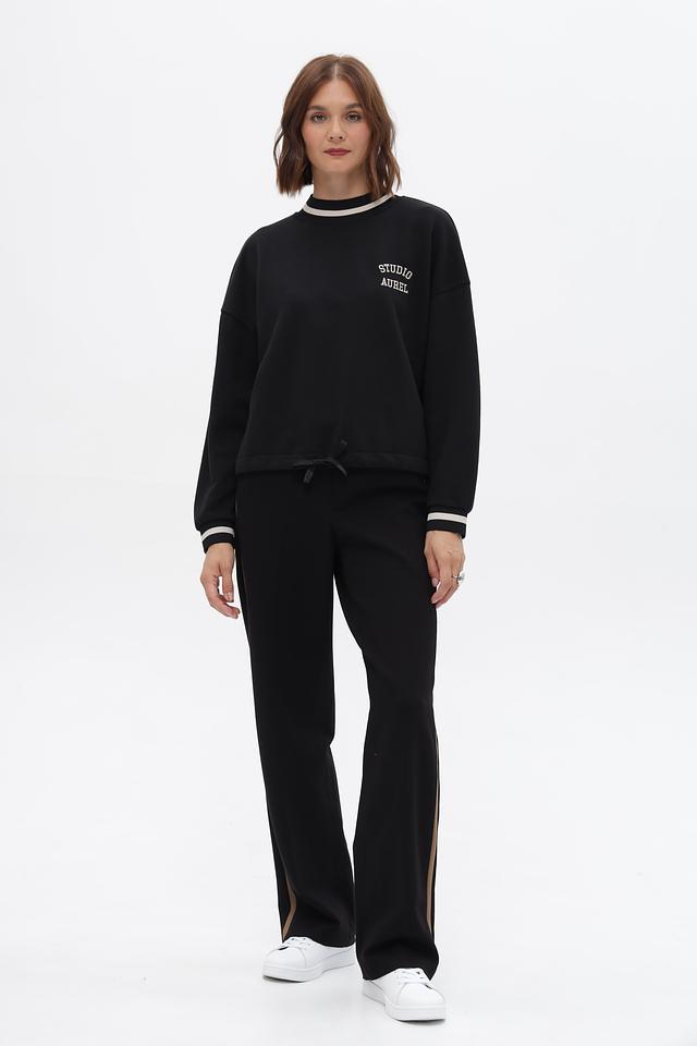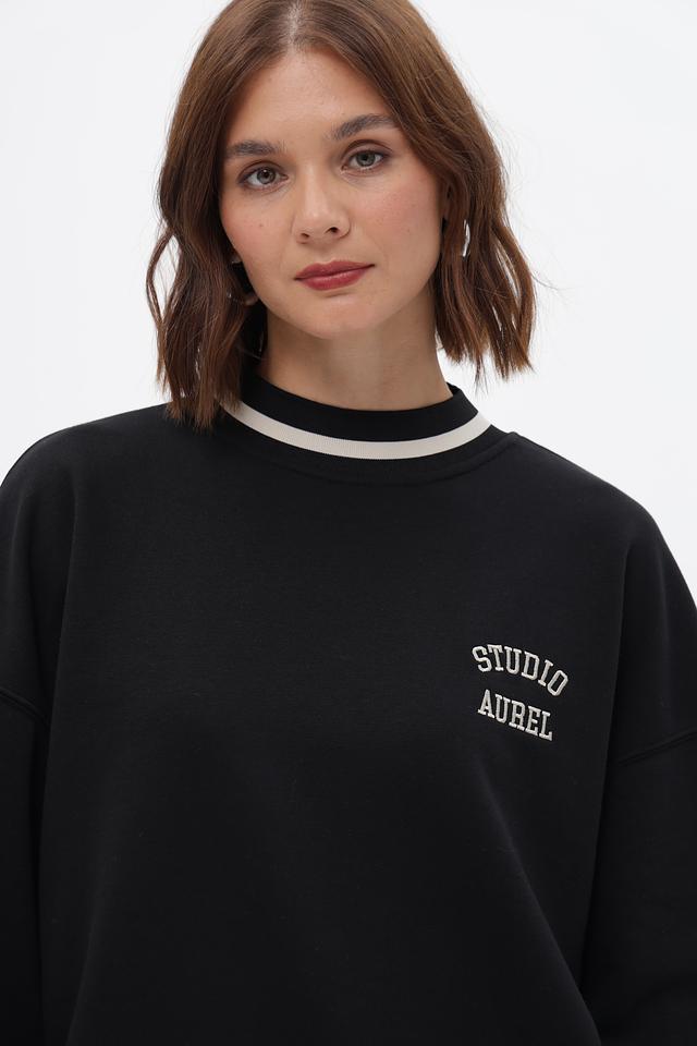 Дизайн пуловера лаконичен и минималистичен. На груди расположен белый логотип бренда 'STUDIO AUREL', выполненный в винтажном стиле. Контрастная белая полоса проходит по горловине и на рукавах, придавая модели спортивный вид.