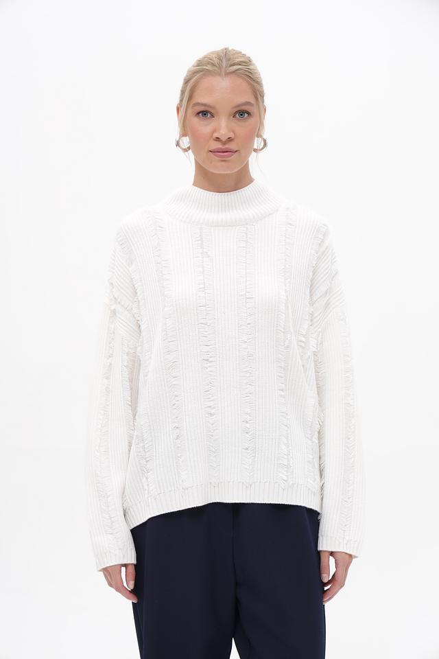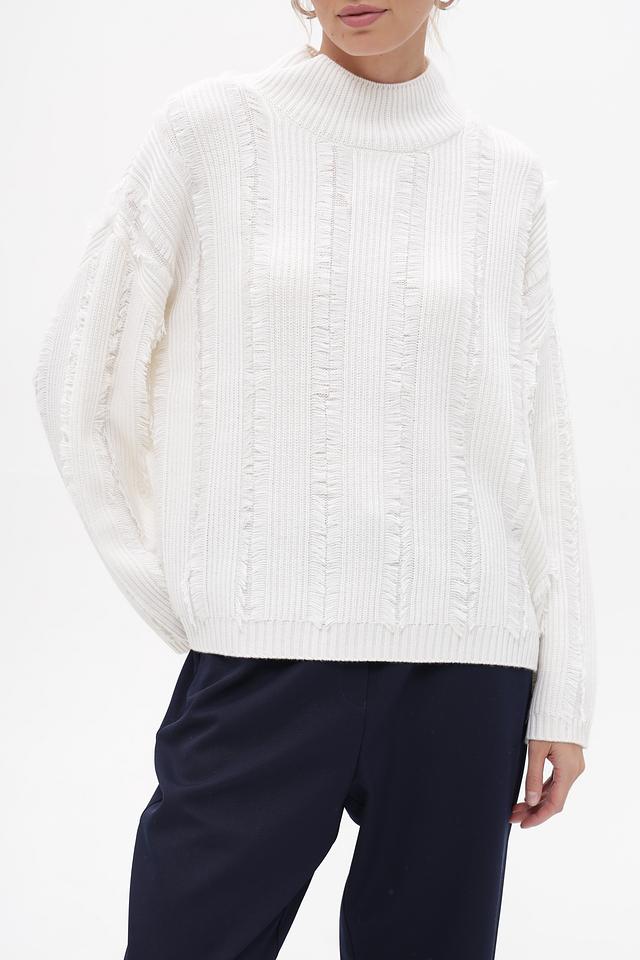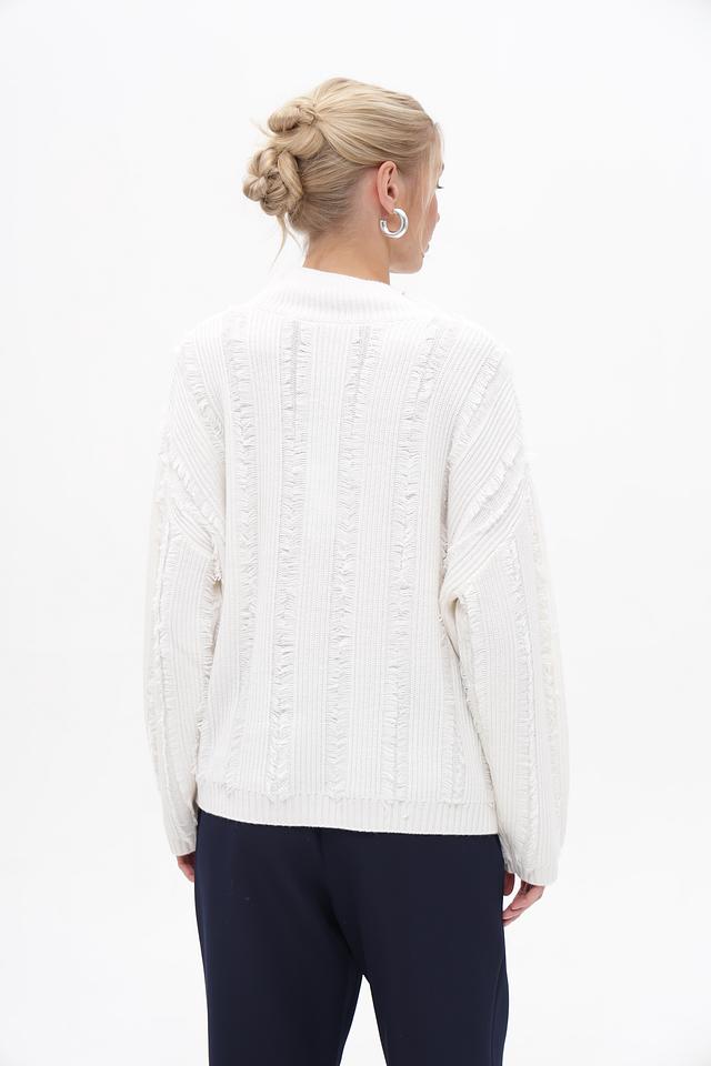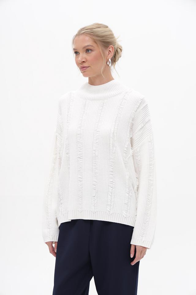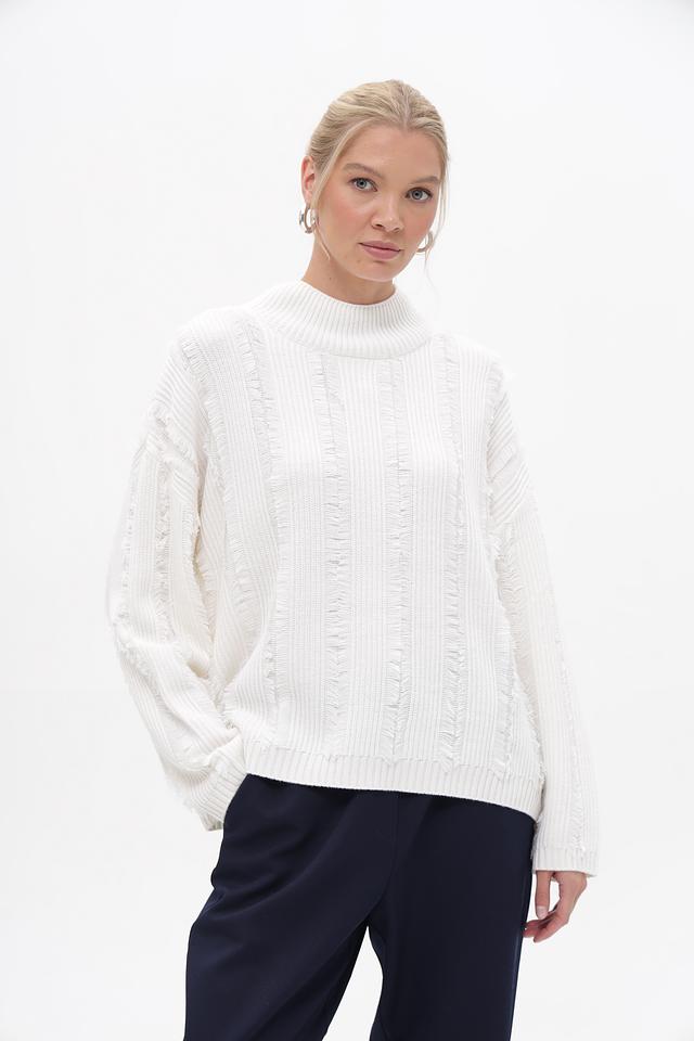 Пуловер имеет свободный крой, который обеспечивает комфорт и свободу движений. Выразительный узор из кос добавляет изделию текстуру и визуальный интерес. Высокий воротник-стойка делает модель более универсальной и позволяет сочетать ее с различными аксессуарами.