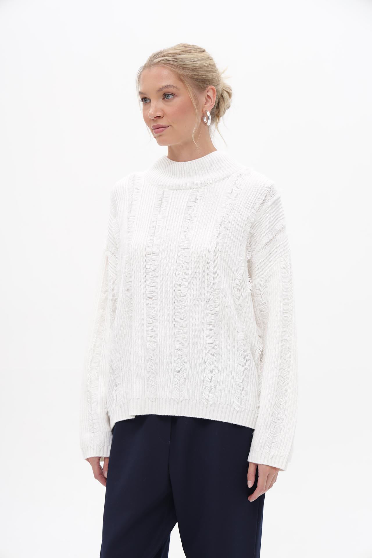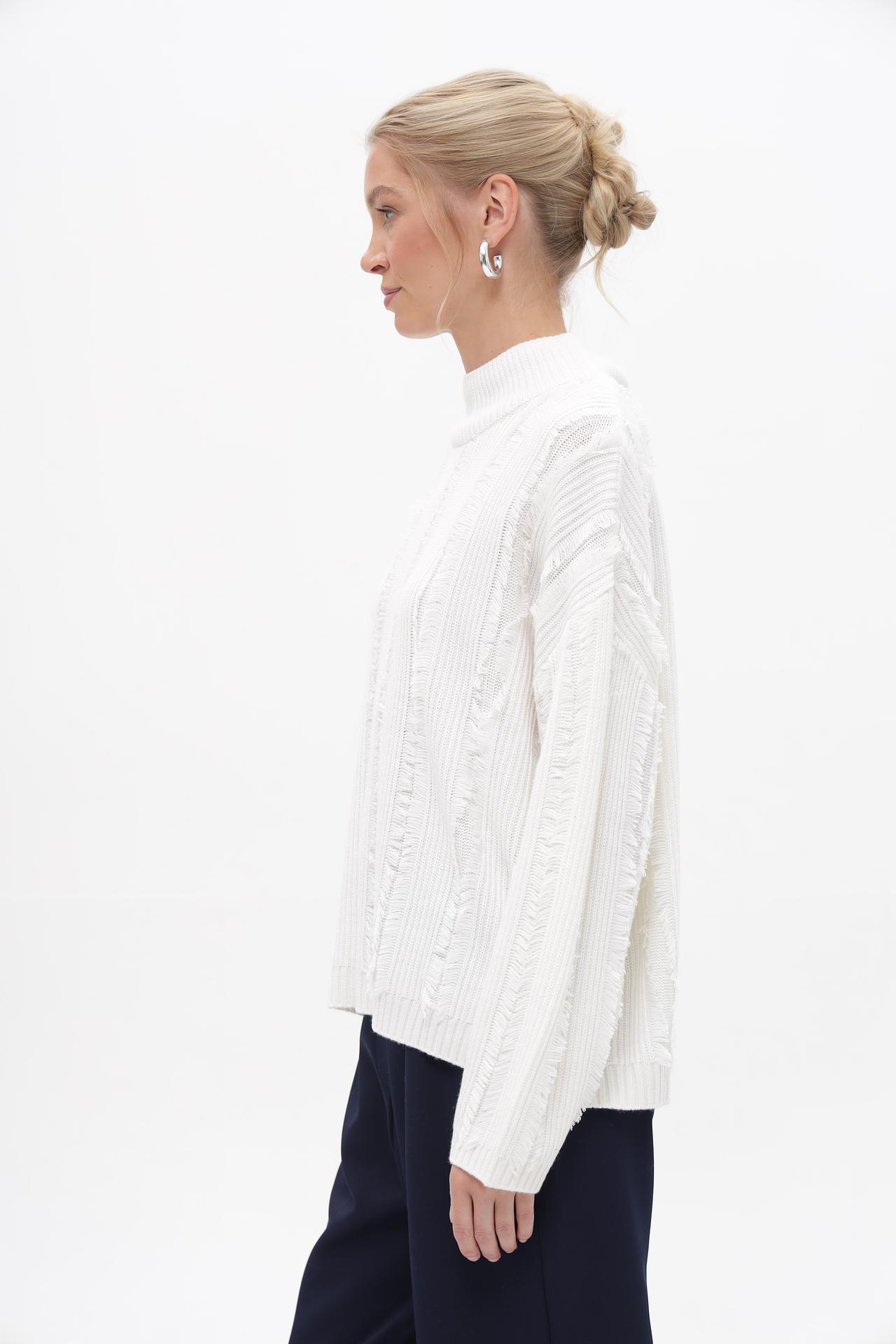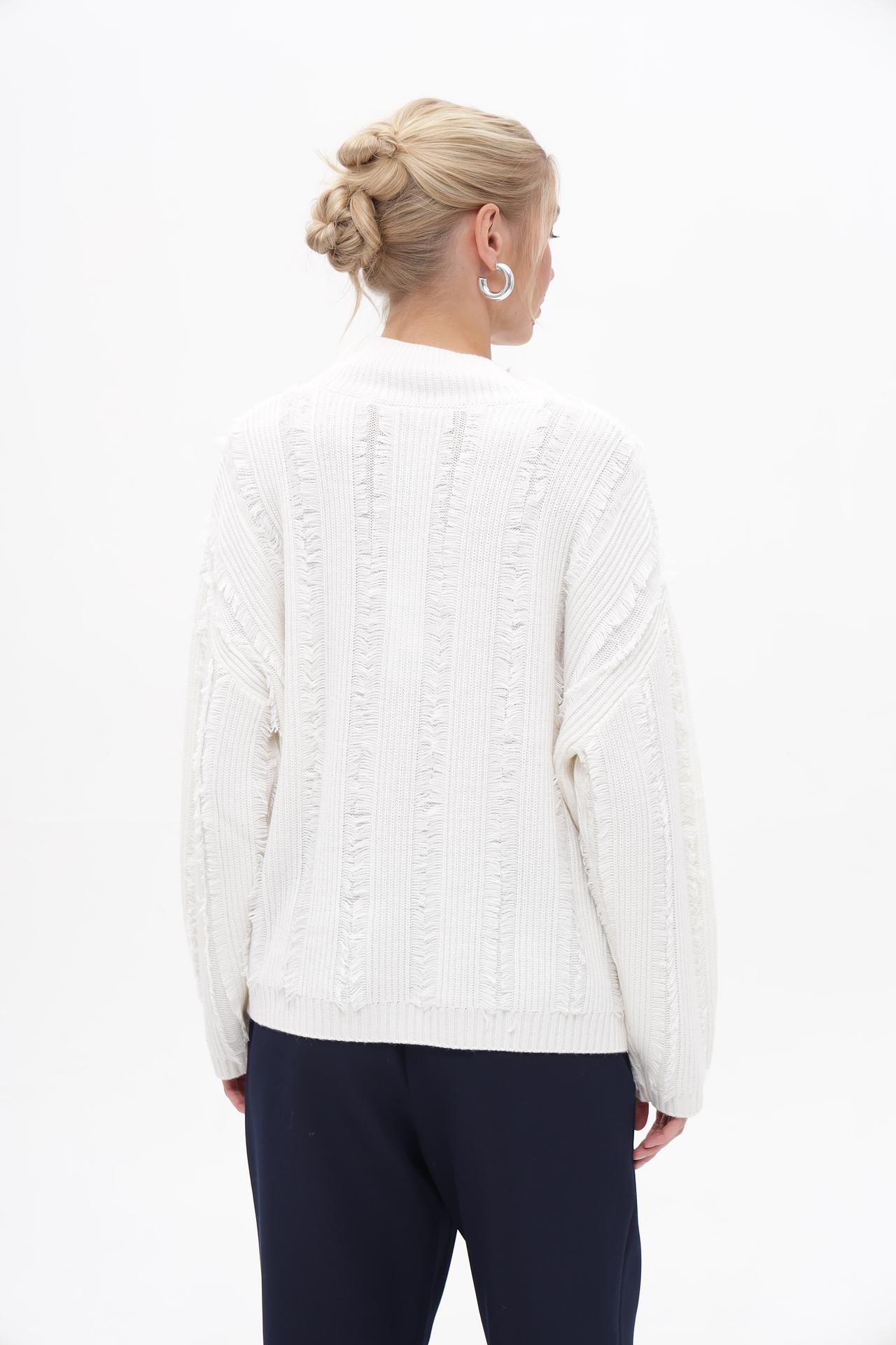 - Дизайн: Модель выполнена в классическом стиле с высоким воротником и оригинальным вертикальным узором с необработанным краем, добавляющим текстуру и объем.