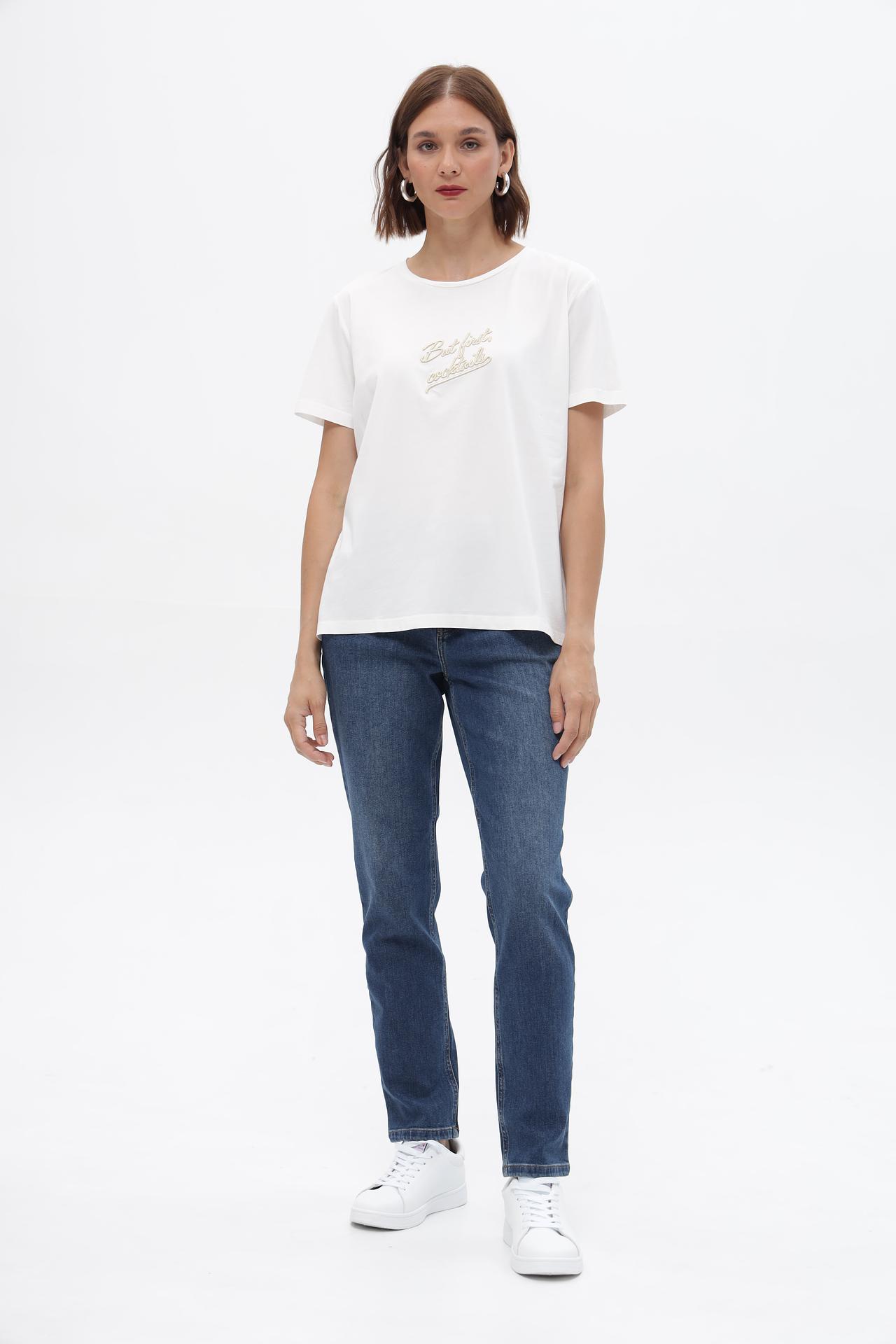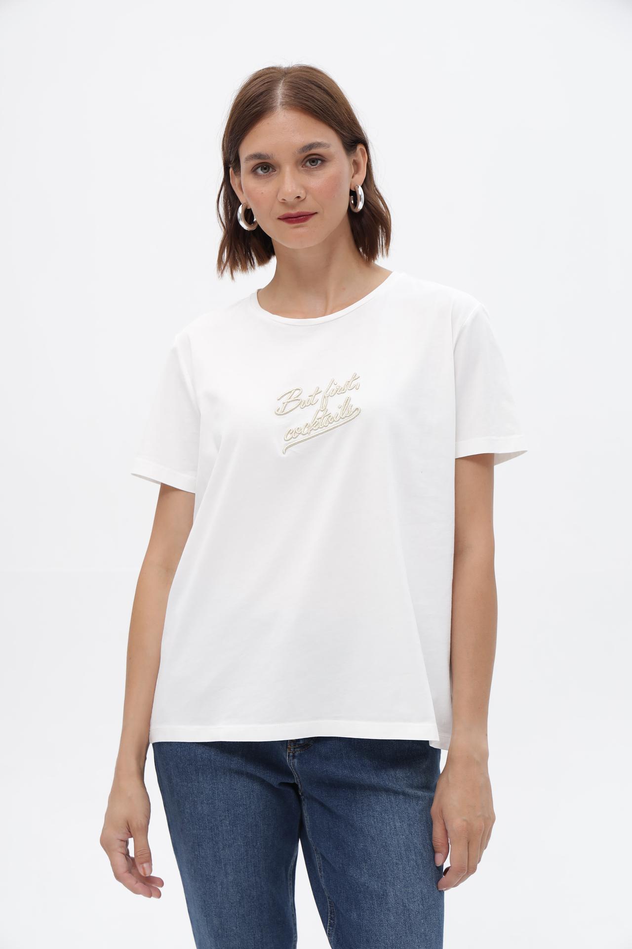 - Дизайн: Классический прямой крой с коротким рукавом и округлым вырезом горловины. На груди расположен элегантный принт в золотистом оттенке с надписью "But first, cocktails", добавляющий изюминку.
