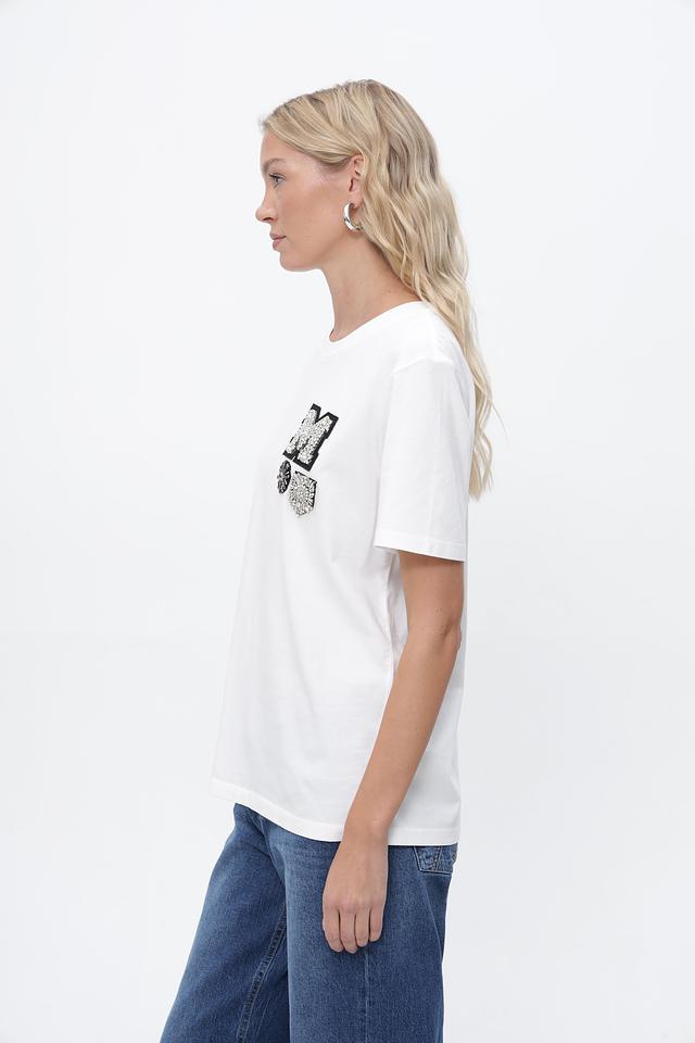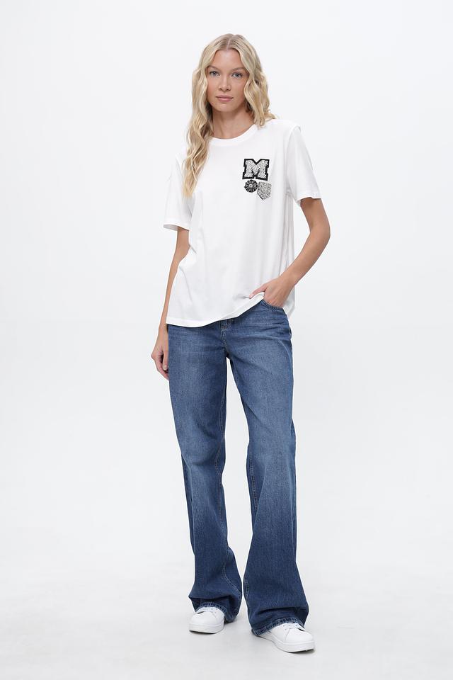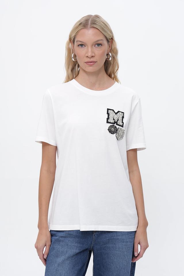 Особенность модели — стильная аппликация в виде буквы "M" и цветочного мотива, выполненная в черно-белой гамме. Этот декор добавляет футболке оригинальности и индивидуальности.